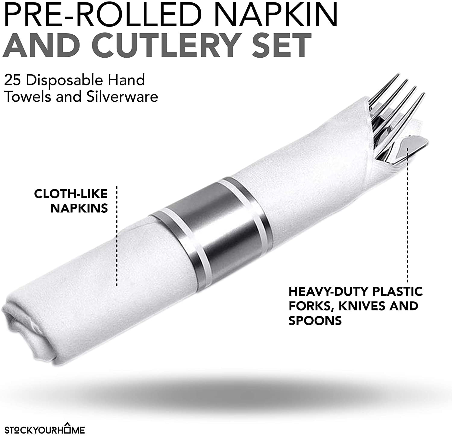 Fancy Silver Pre-Rolled Napkin and Cutlery Set – Service for 25 Disposable Hand Towels and SilverwareAdd a touch of class and distinction to all your table settings with our Elegant Pre-rolled Napkin and Cutlery Set. These cloth-like napkins and heavy-duty plastic forks, knives and spoons provide the same upscale look as real silverware without the expense. Each package contains 25 disposable table settings individually wrapped with a decorative strap perfect for weddings, parties, and all other occasions.