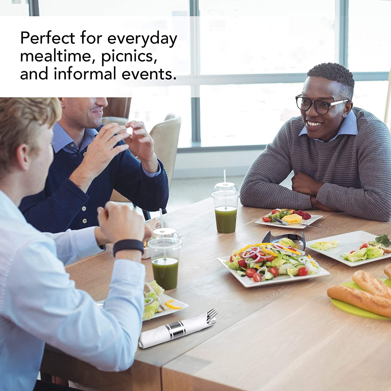 - PERFECT FOR ANY OCCASION: Taste is evident in the sleek, modern, and stylish design of this pre-rolled elegant napkin and cutlery set. An upscale plastic silverware perfect for wedding receptions. The sleek silver sheen gives the cutlery an elegant feel that is perfect for formal dinners, banquets, and dinner parties as well as everyday mealtime, picnics, and informal events.