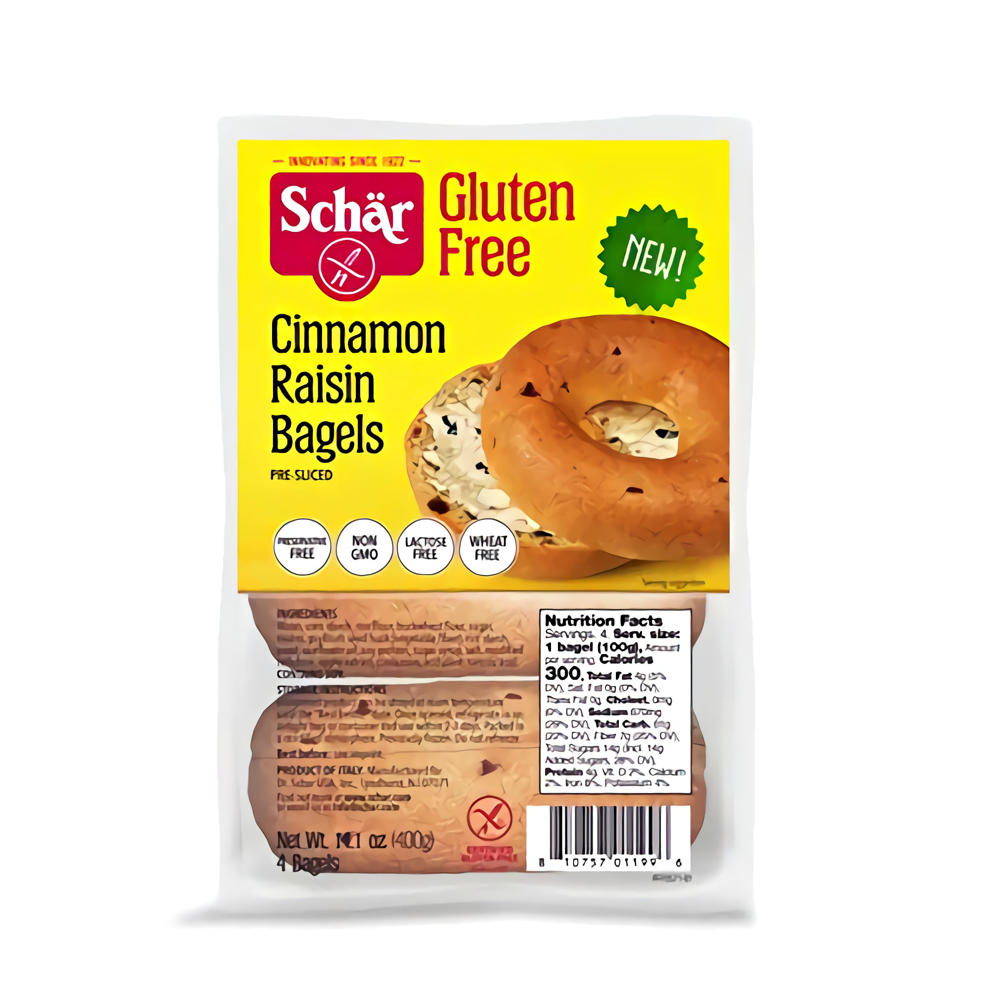 - One 14.1 oz sealed package of Gluten Free Cinnamon Raisin Bagels (4 Bagels).