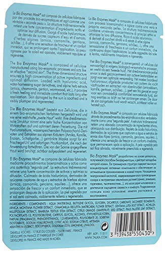 Talika Bio Enzymes Mask Hydrating is made of bio cellulose, a 100% natural fiber used as artificial skin in reconstructive surgery, offering a concentration in active ingredients 10 times higher than any other material. Perfectly molding the contour of the face like a second-skin, Talika Bio Enzymes Mask Hydrating infuses the skin with a powerful combination of natural ingredients with high moisturizing and repairing properties: Water-harnessing sugar help restoring the skin barrier while sodium hyaluronate rejuvenates the skin and natural plants extracts (Arnica, Chamomilla Recutita, Gentian, Absinth…) soothe the skin, restore moisture and reduce the sensation of tightness.