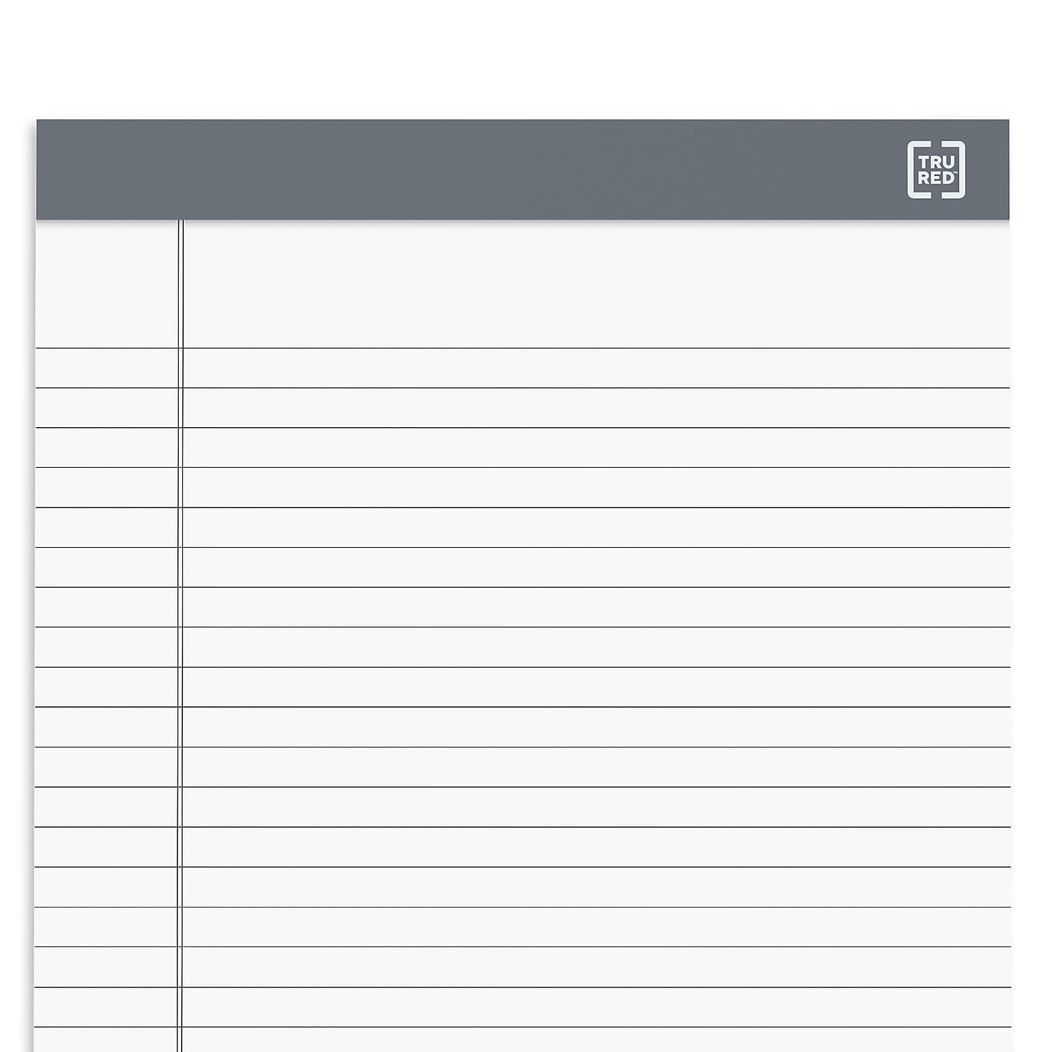Keep your office supply closet fully stocked with this 12-pack of TRU RED white medium-weight notepads.Write notes by hand with this versatile writing pad. The wide ruled lines deliver plenty of space to keep clear and organized minutes from conference calls and records of brainstorming sessions. Page perforation lets you easily remove sheets to share notes and diagrams with colleagues. The top-bound format on hese TRU RED white medium-weight notepads helps you to rapidly flip through pages to find important information. Medium-weight notepad with durable backer. Sheet size: 8.5"" x 11.75"" (letter). 50 perforated sheets per pad. 12 pads per pack. Top-bound design allows you to quickly flip through papers to find information. Wide ruled pads great for keeping writing neat and legible. White paper. Sold as 12/Pack.
