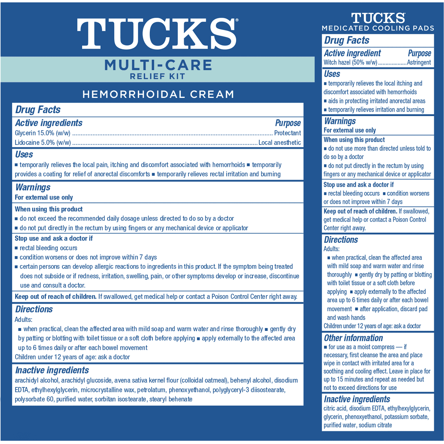 TUCKS MULTI-CARE RELIEF KIT offers comprehensive treatment for the full range of hemorrhoid and rectal pain symptoms: Maximum Strength 5% Lidocaine Cream with calming colloidal oatmeal numbs intense hemorrhoid pain and protects irritated, raw skin for lasting relief. Witch hazel pads soothe burning, itching skin and mild hemorrhoid discomfort. The ultra-soft pads also gently cleanse without worsening irritation and can be used a moist compress on hemorrhoids for extra cooling, soothing relief. Multi-Care Relief Kit contains one 0. 5oz tube of maximum strength lidocaine cream and one 40ct jar of witch hazel pads – it’s what you need, when you need it.