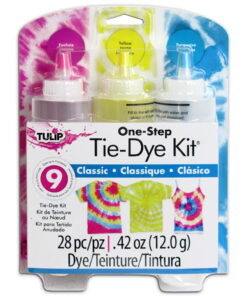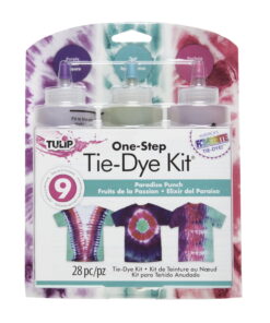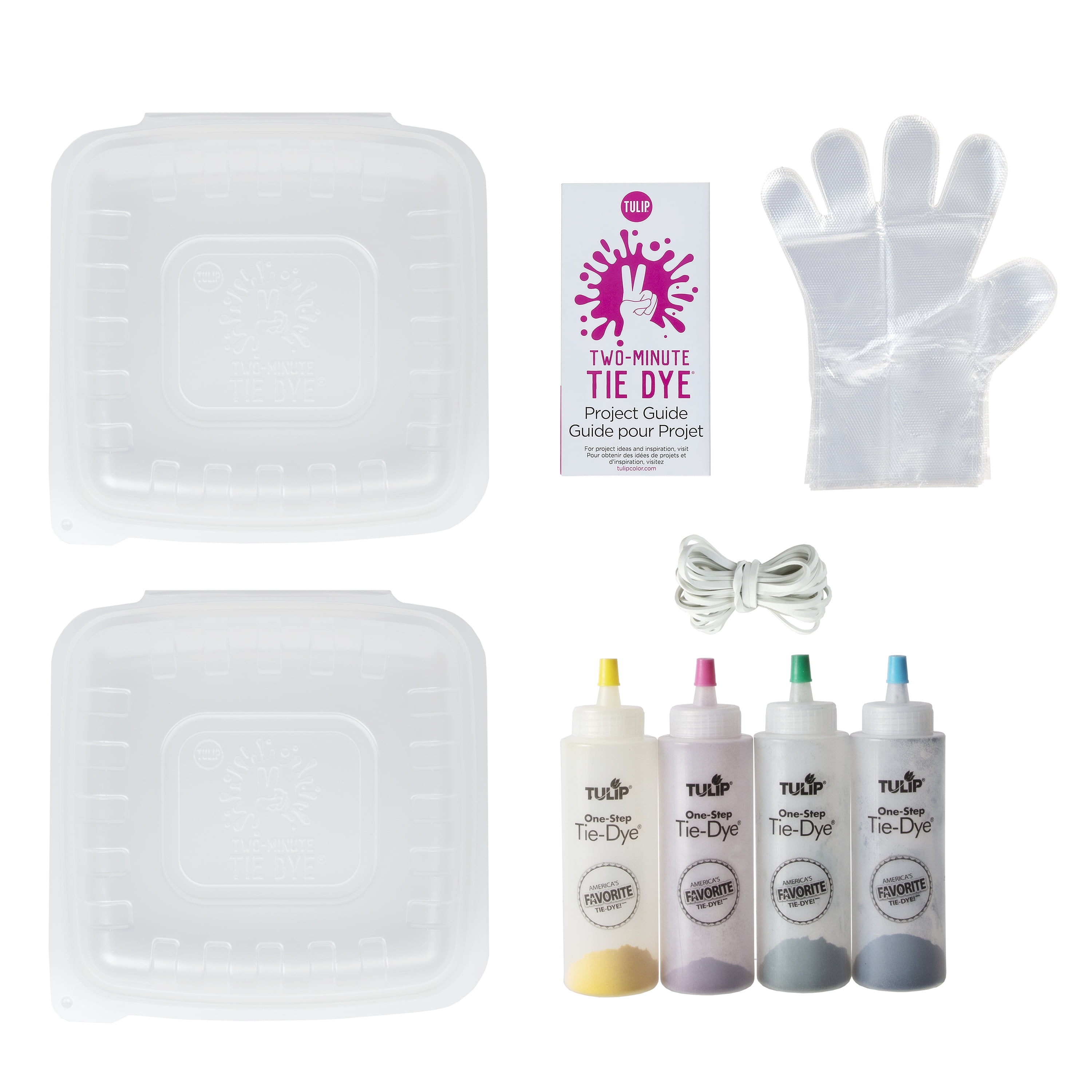 The Tulip Two-Minute Tie-Dye Fruit Punch Kit speeds up the dye set process from 8 hours to 2 minutes with the same vibrant results! This patent-pending process features specially made microwaveable containers designed specifically for Two-Minute Tie Dye, and the supplies you need to make tie-dye magic in just minutes. Kit includes 2 containers, 4 squeeze bottles containing dye colors: Yellow, Fuchsia, Green, and Turquoise; 10 rubber bands, 2 pairs of protective gloves and a project guide. For use with 100% cotton fabrics only.