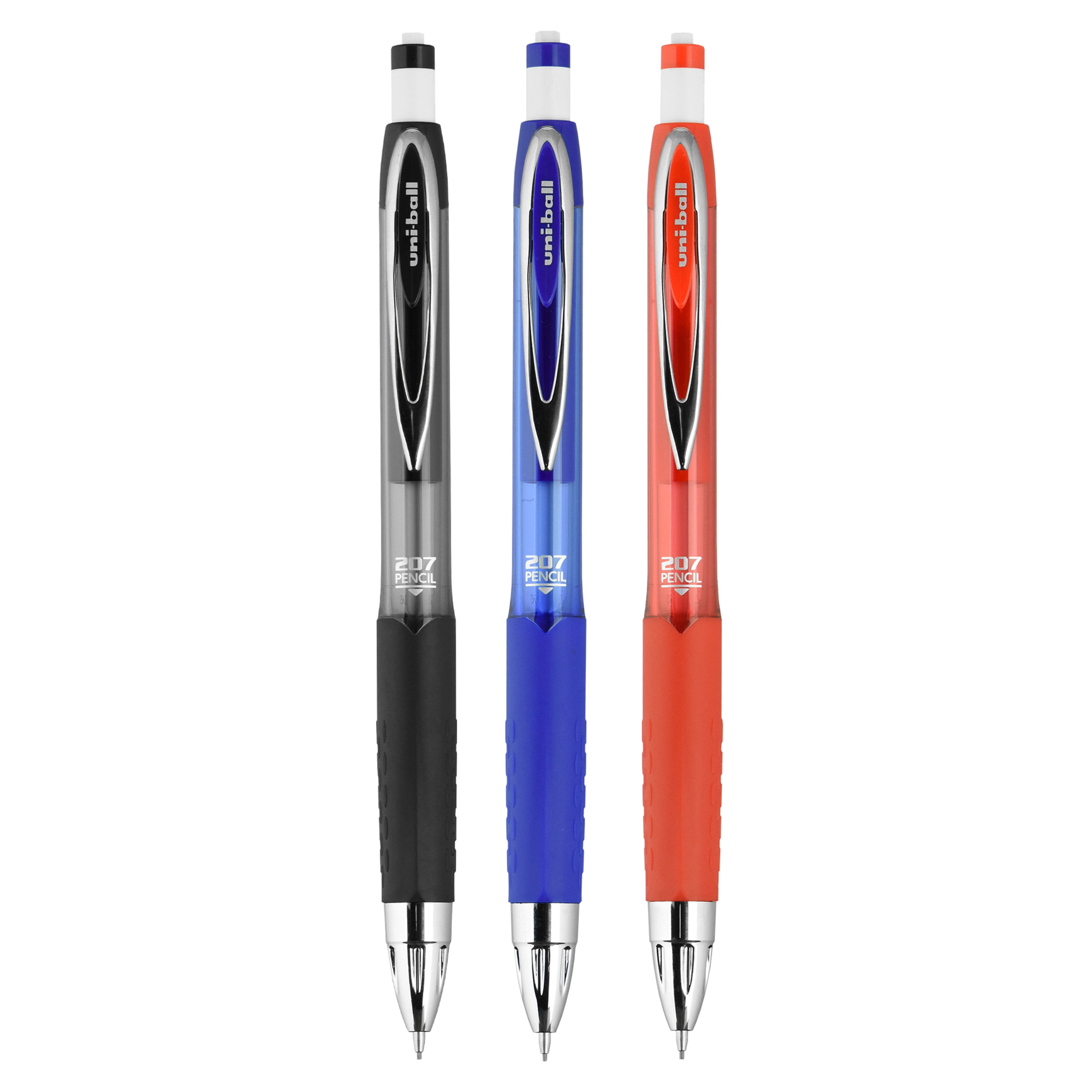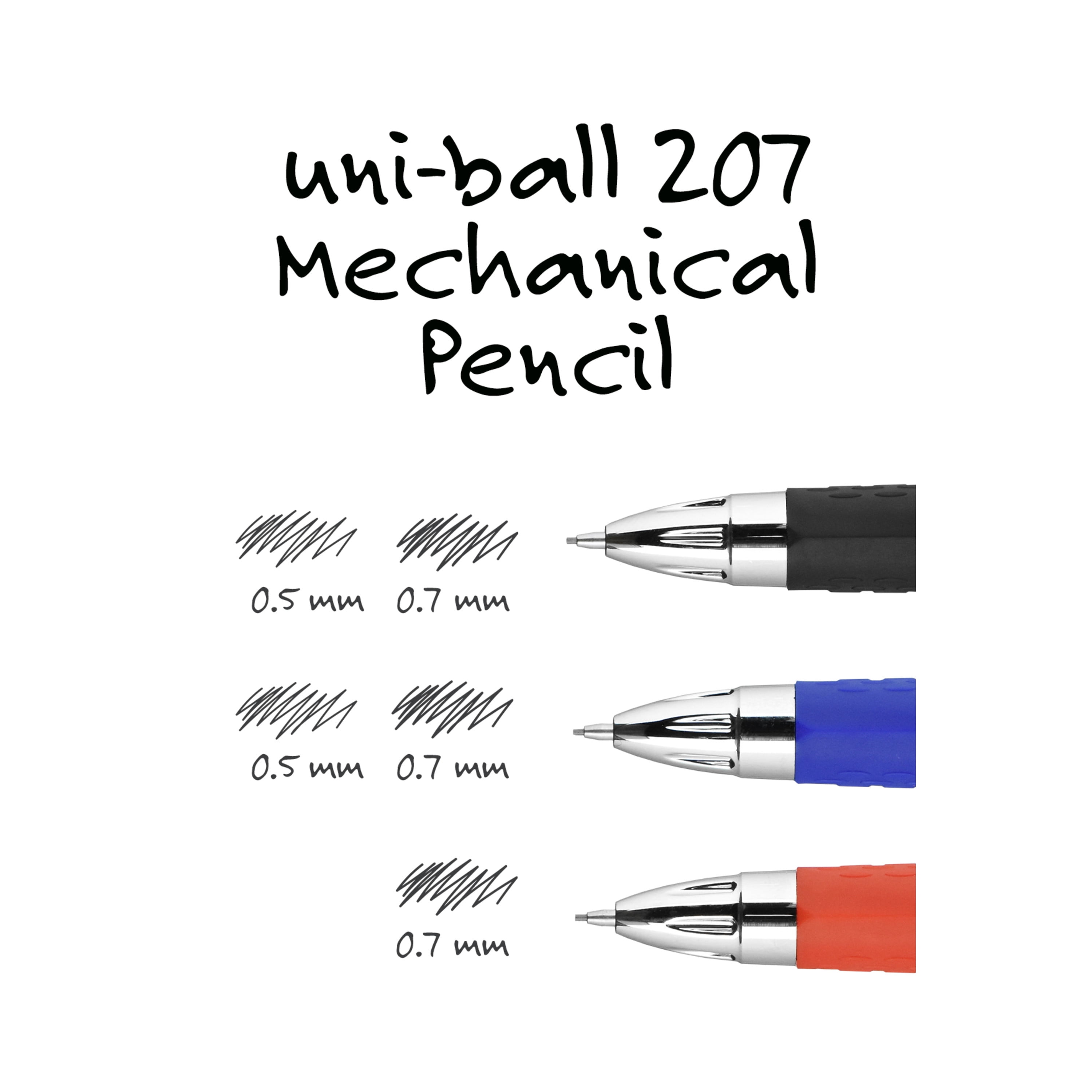 Keep your thoughts flowing with auto-advancing 207 Mechanical Pencils from Uni-ball. The 0.7 mm HB #2 lead delivers strong, broad lines. The lead moves forward as you write, so you don’t have to pause your thoughts to advance the lead. A multi-faceted eraser with twelve corners and sides allow for quick and clean revisions. With a shock absorbing tip, changes in pressure get balanced out as you write or draw, reducing breakage. These break-resistant pencils are ideal for drafting as well as for school work, art projects and note-taking. They have a comfort grip that reduces writing fatigue while assisting with precision as well. Professional grade 207 refillable pencils are the perfect complement to the classic 207 gel pen.