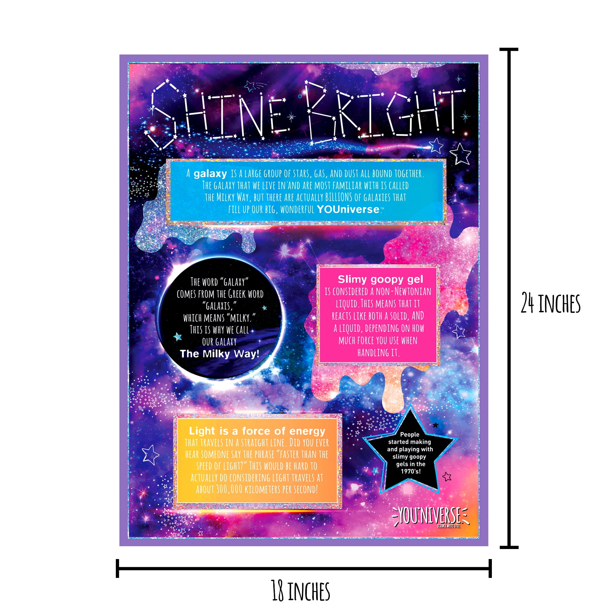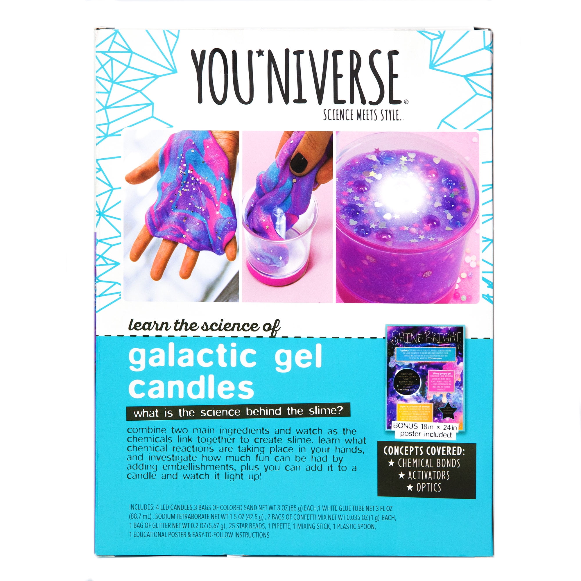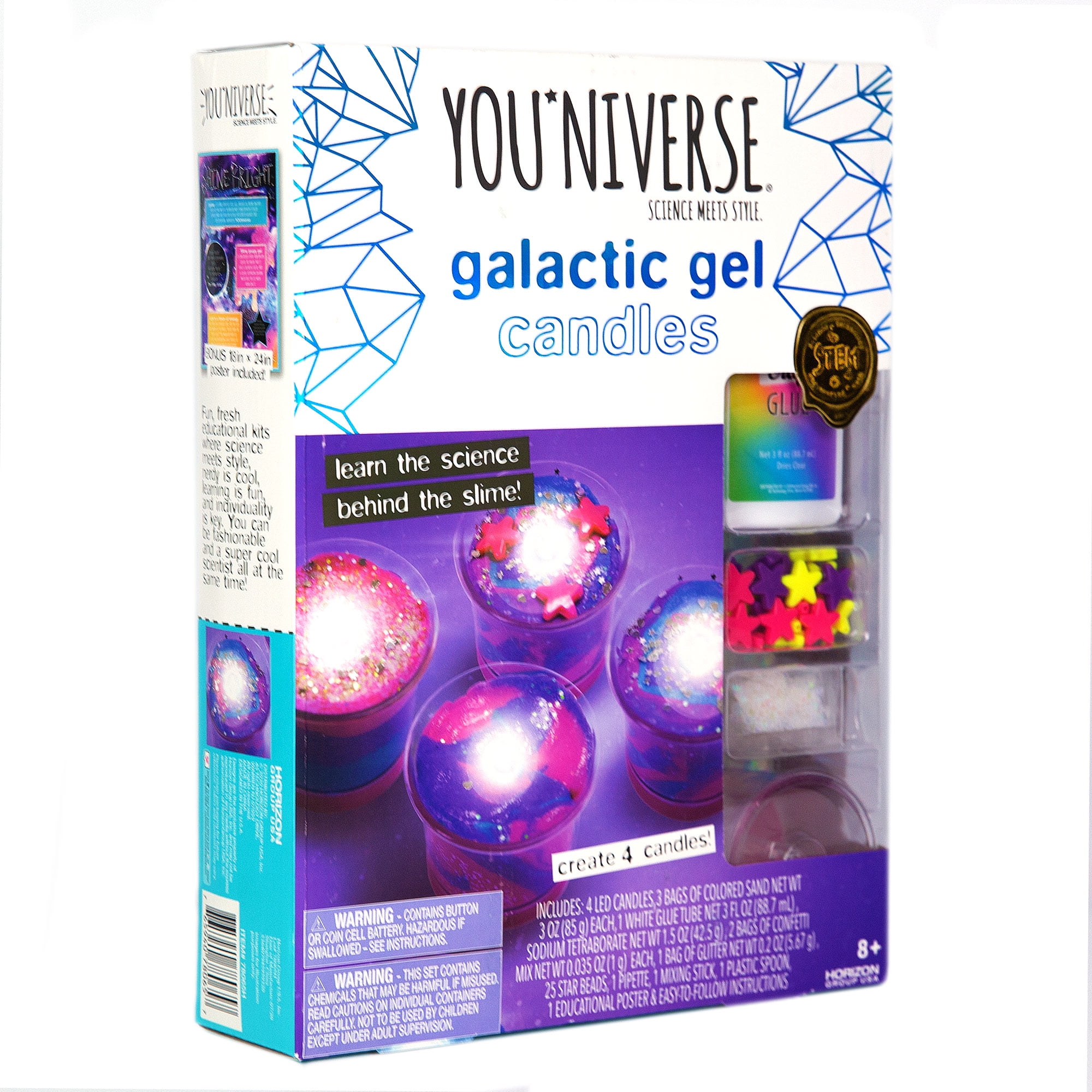 Create hooey-gooey compound candles with the YOUniverse Galactic Gel Candles kit! Combine simple ingredients and watch as they transform from solid and liquid to their own slimy, gloopy state of matter. Make your galactic gel sparkle by adding glitter and confetti, then fill the candle bases with your creation. Add some extra sparkle and stars on top as a finishing touch, then turn on your candle and watch it glow! The perfect accessory for any nightstand, desk or dresser, amaze your family and friends with your D.I.Y. decor! Recommended for slime fanatics ages 6 and up.