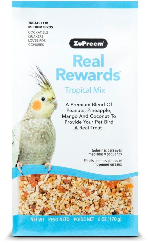 ZuPreem Real Rewards Tropical Mix Treats for Medium Birds offers a delicious mix of peanuts, pineapple, mango and coconut to provide reward occasions for those special moments you share with your bird.