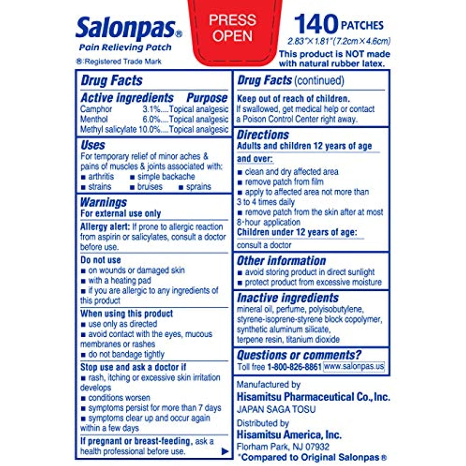 Salonpas Pain Relieving Patch 2.83′ x 1.81′ (Various Size Packs) (1 Box (140 Patches))