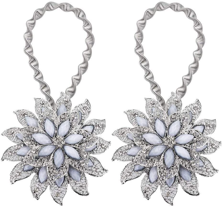 2 Pcs Crystal Curtain Magnetic Tiebacks – Decorative Big Flower Curtain Clips Buckle with Stretchy Wire Rope, Sparkling Drapery Holdsbacks for Home Office Decor, Silver