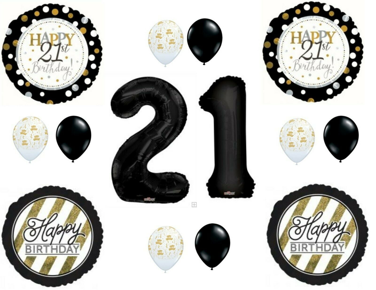 A 14 piece 21st Birthday Gold and Black Birthday Party balloon decorating kit! Great balloons to display at your party!You will receive with this kit:Two (2) 34" Black number mylar shape balloons….a #2 and a #1..Two (2) 18" Gold and Black Polka Dots Happy 21st Birthday round mylar balloons.Two (2) 18" Gold and Black stripes Happy Birthday round mylar balloons.Eight (8) 11" Coordinating latex balloons…4 White with Gold lettering Happy Birthday and 4 Black.All balloons are new and shipped uninflated. Just add helium!21st Happy Birthday Black & Gold Party Balloons Decoration
