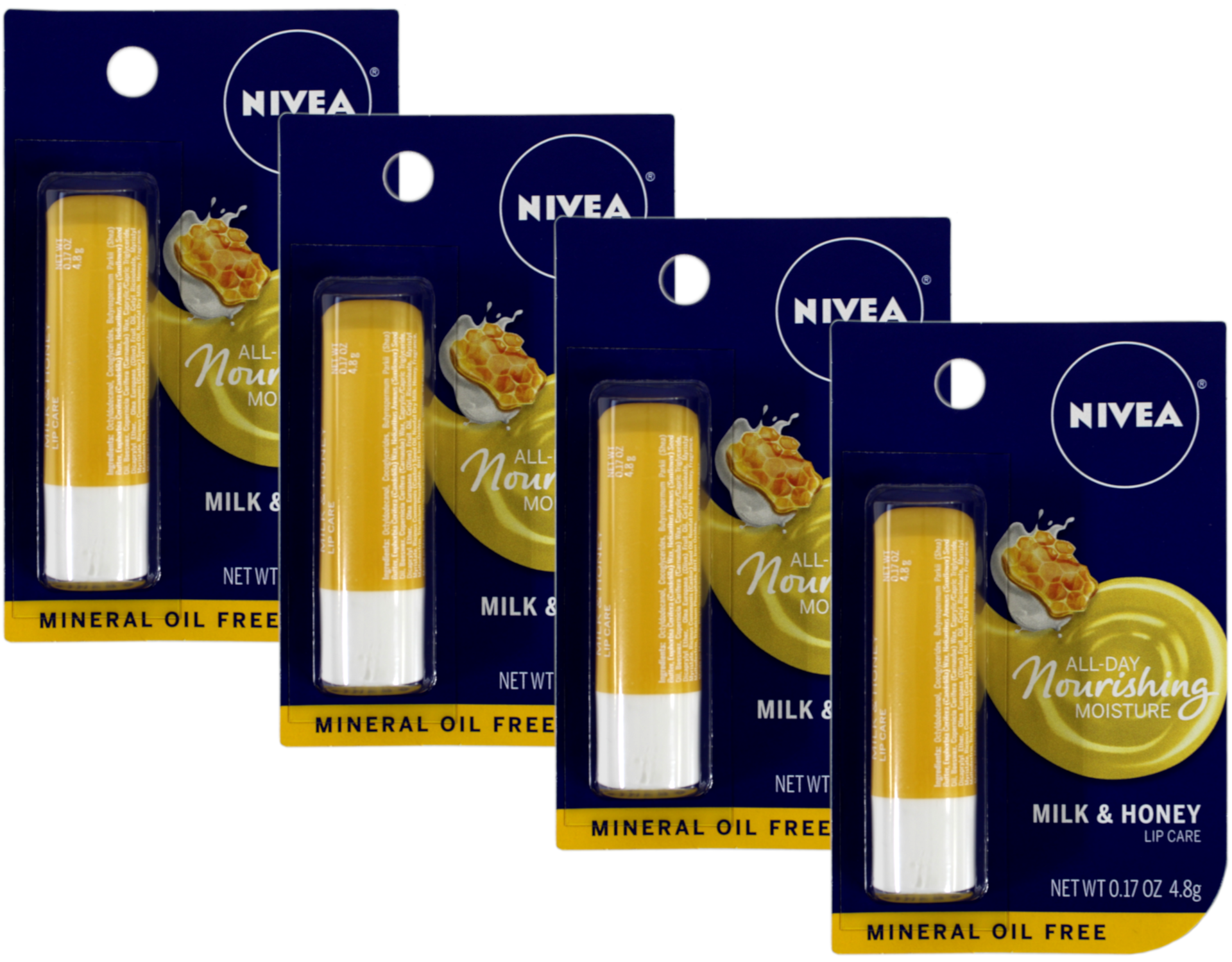 4 Pack NIVEA A Kiss of Milk & Honey Natural Defense Soothing Lip Care 0.17oz Eac