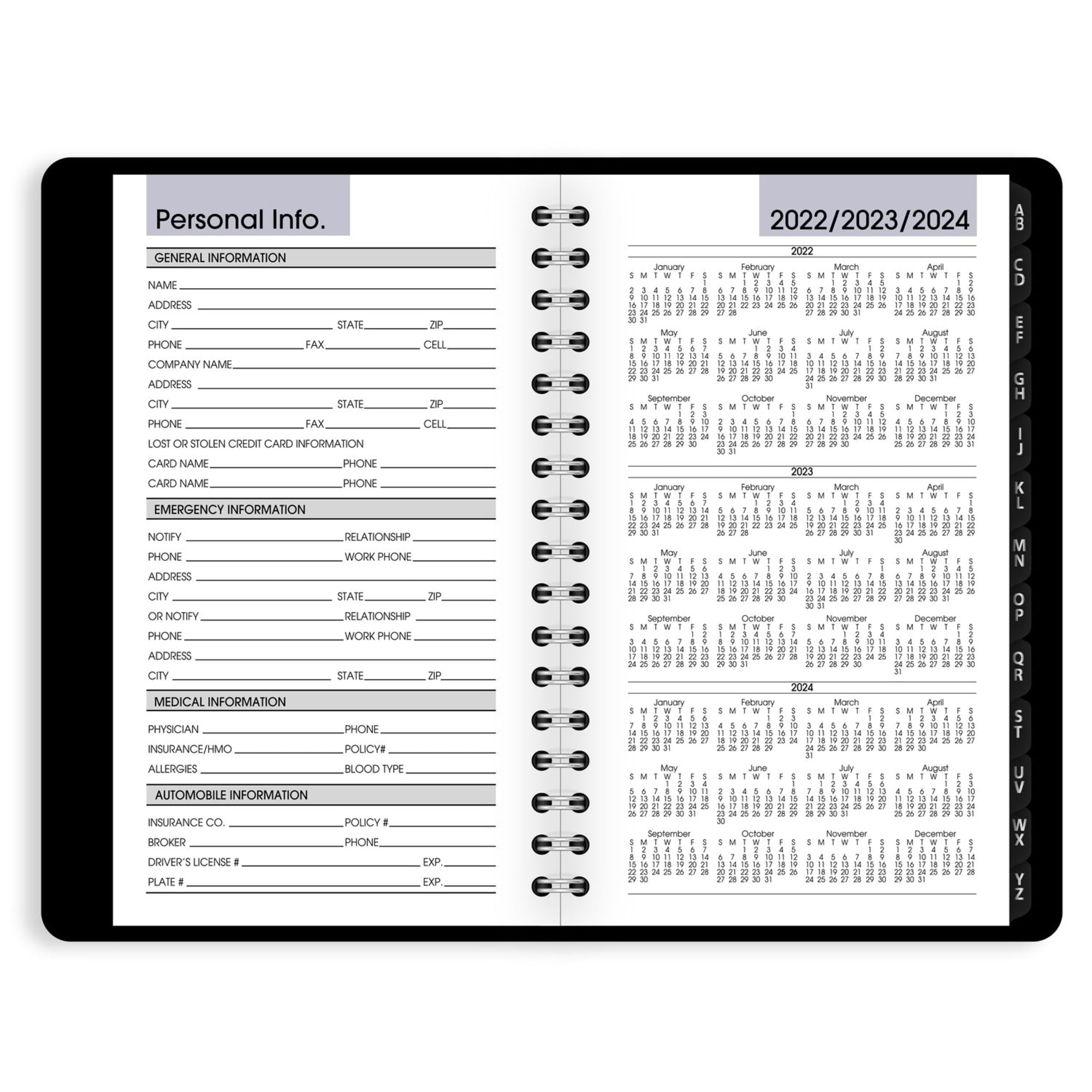 - Special pages include a three year reference calendar, personal information and a telephone/address section