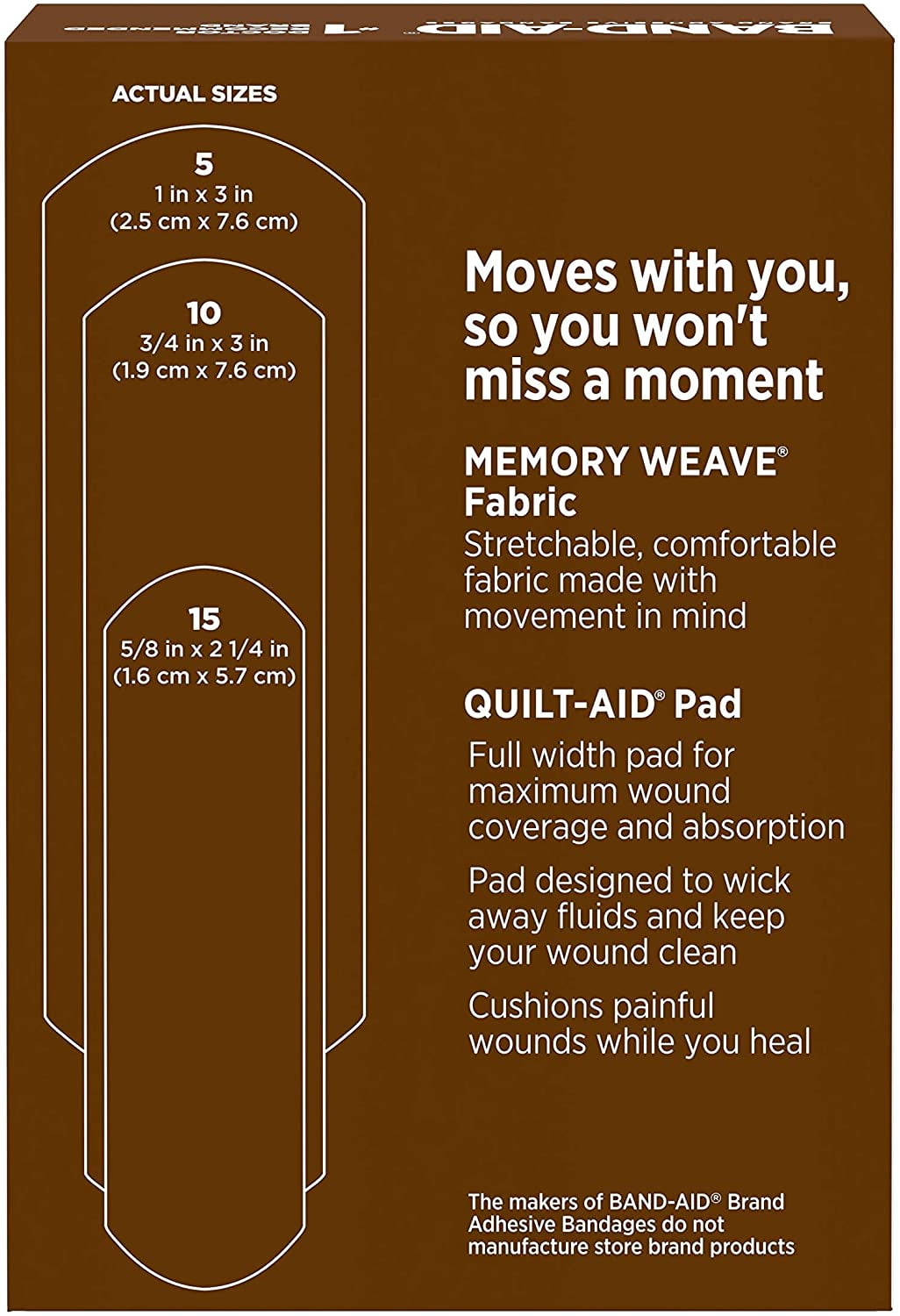 Band-Aid Brand Ourtone Flexible Fabric Adhesive Bandages in assorted sizes provide a wound care option in shades for Brown skin tones. Designed to blend in with your skin tone, these fabric bandages in shade BR65 are made with Memory Weave fabric to cover and protect minor wounds, cuts and scrapes by stretching, bending, and flexing with your skin as you move. From the #1 doctor recommended bandage brand, the flexible bandages protect against dirt and germs for up to 24 hours to help with your healing wounds. Each bandage features a Quilt-Aid pad for complete coverage that won’t stick to the wound as it wicks away blood and fluids, allowing for gentle removal. Apply the sterile adhesive bandage to clean, dry skin for minor wound care and change daily, when wet, or as needed. Launching a range of bandages in light (BR45), medium (BR55) and deep (BR65) shades for Brown skin tones, Band-Aid Brand Ourtone Adhesive Bandages embrace the beauty of diverse skin.