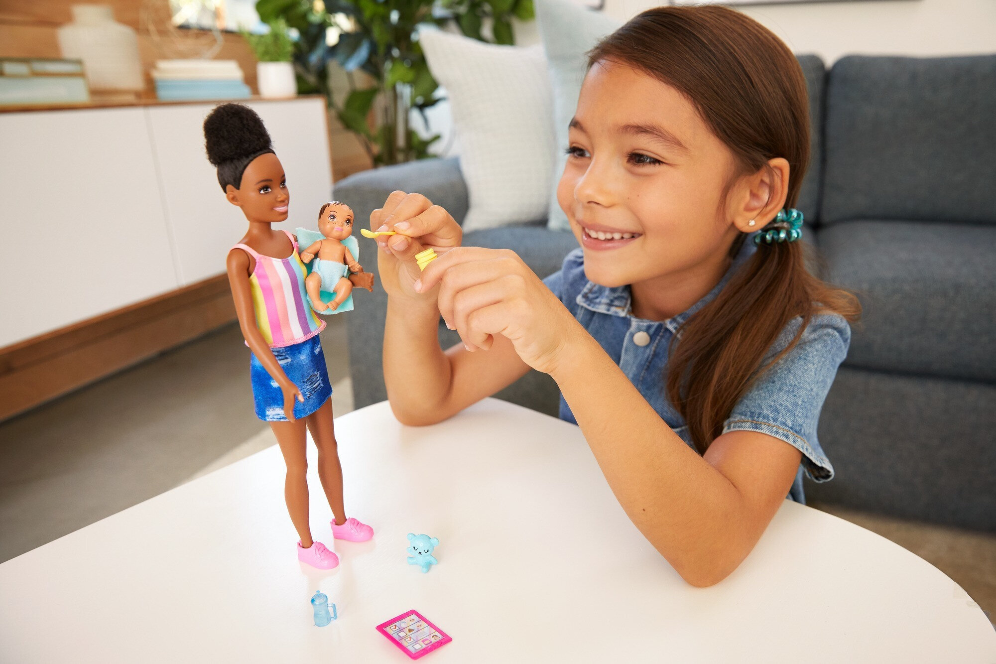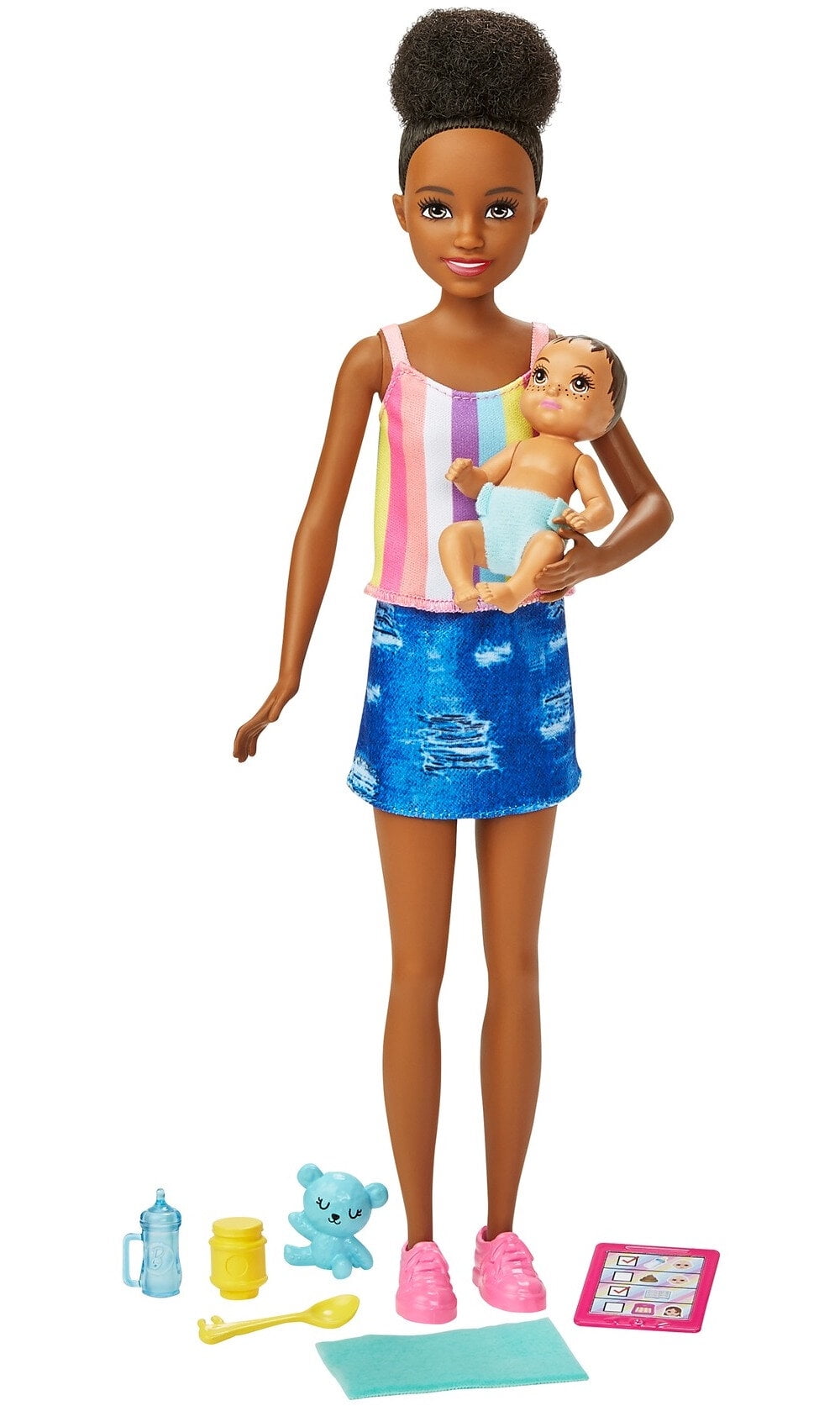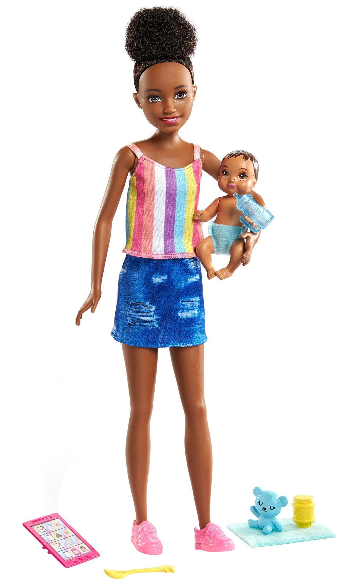 Young kids can be the babysitter with Barbie Skipper Babysitters Inc. doll and accessory sets that include a doll and storytelling pieces to play out classic moments. Each babysitter doll is prepared for the night with four accessories that include a baby bottle and a spoon. The accessories have handles that fit on the dolls’ hands for realistic playtime action. Dolls wear casual outfits.Age Grade: 3 Years and up