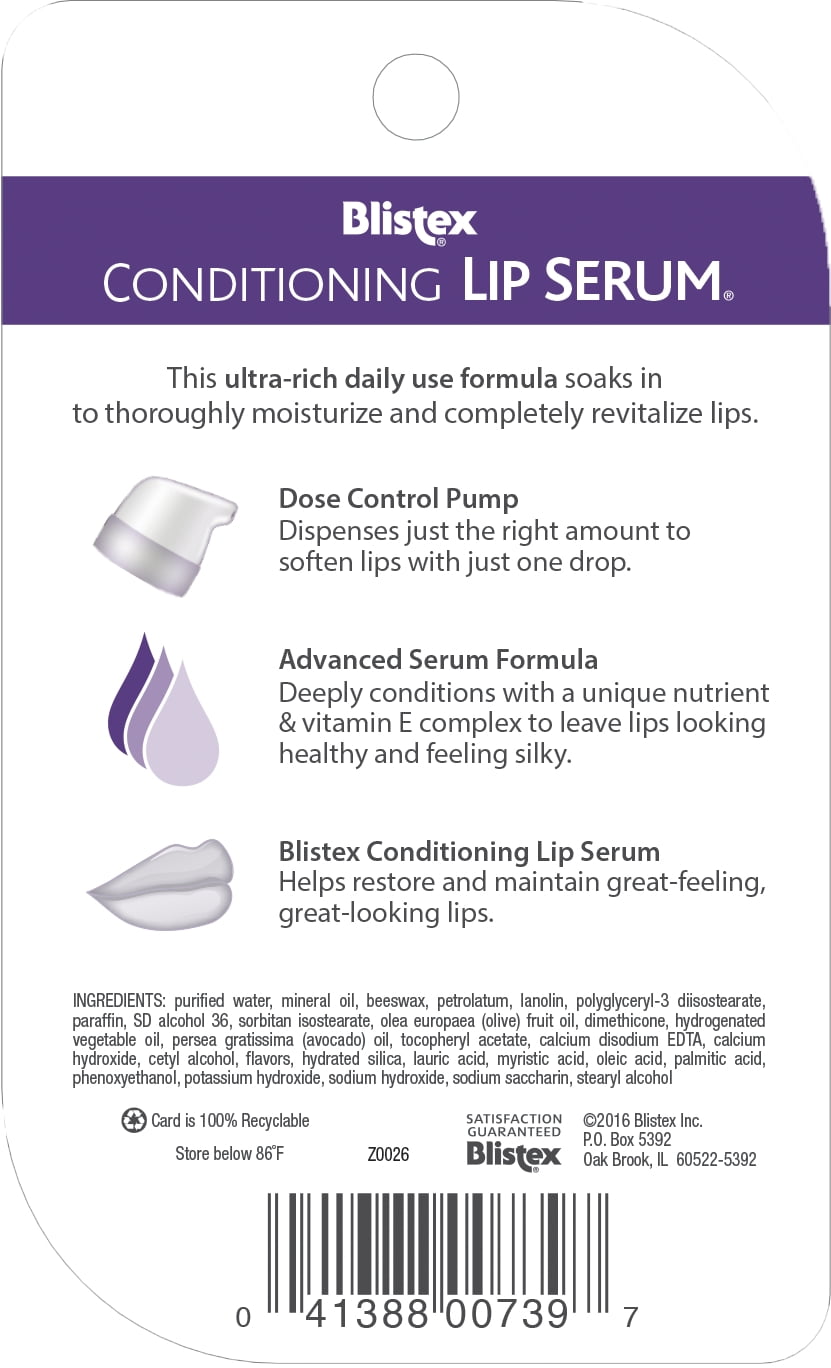 Blistex Conditioning Lip Serum is an ultra-rich daily use formula that soaks in to thoroughly moisturize and completely revitalize lips. Its advanced serum formula deeply conditions with a unique nutrient and vitamin E complex to leave lips looking healthy and feeling silky. Blistex Conditioning Lip Serum helps restore and maintain great-feeling, great-looking lips.