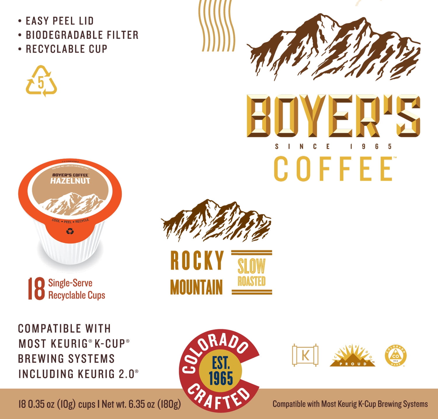 Boyer’s Coffee Hazelnut Coffee is a Hazelnut lover’s dream. Smooth and lightly roasted, Hazelnut is one of the most popular flavored coffees Boyer’s makes. Balanced with flavor and nuttiness, this coffee will satisfy all of your coffee and sweet tooth needs–whether you’re looking to perk up in the morning or indulge in a dessert coffee later in the day. Boyer’s Hazelnut Coffee is made with 100% Arabica Coffee beans and slow roasted at altitude, ensuring the smoothest cup of coffee. This box conveniently includes 18 single-serve cups that are compatible with most Keurig K-Cup machines, including 2.0 machines. Cups and packaging are fully recyclable. Whether you’re on the go, or looking to enjoy your coffee with family or friends, these single serve cups are for you. If you love Boyer’s Coffee Hazelnut Coffee or dessert coffees in general, may we also suggest you try Boyer’s Coffee Butterscotch Toffee Coffee.