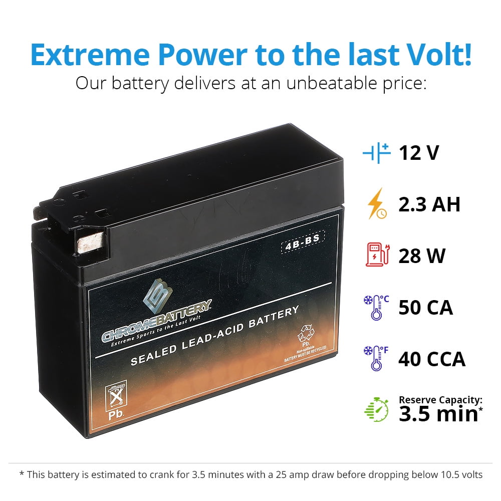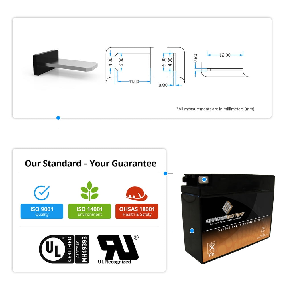 YT4B-BS sealed AGM batteries by Chrome Battery are constructed with lead calcium alloy and absorbed glass mat technology that allows for a completely maintenance-free and high-performance operation. All YT4B-BS Chrome Battery brand AGM batteries are manufactured with the highest quality materials and rigorously tested to ensure safety, OEM compatibility, effectiveness and optimal performance.