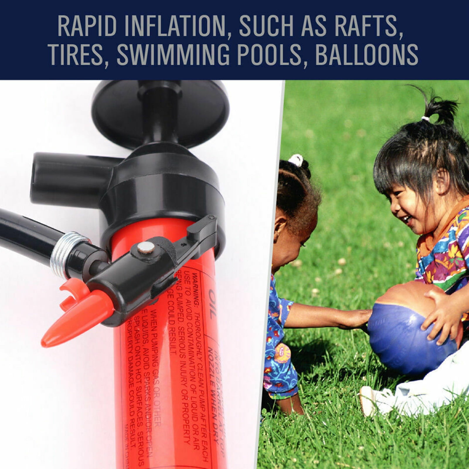 Air pump with 3 different attachments, use this to inflate balls, air mattresses, sleeping mats or bike tires.