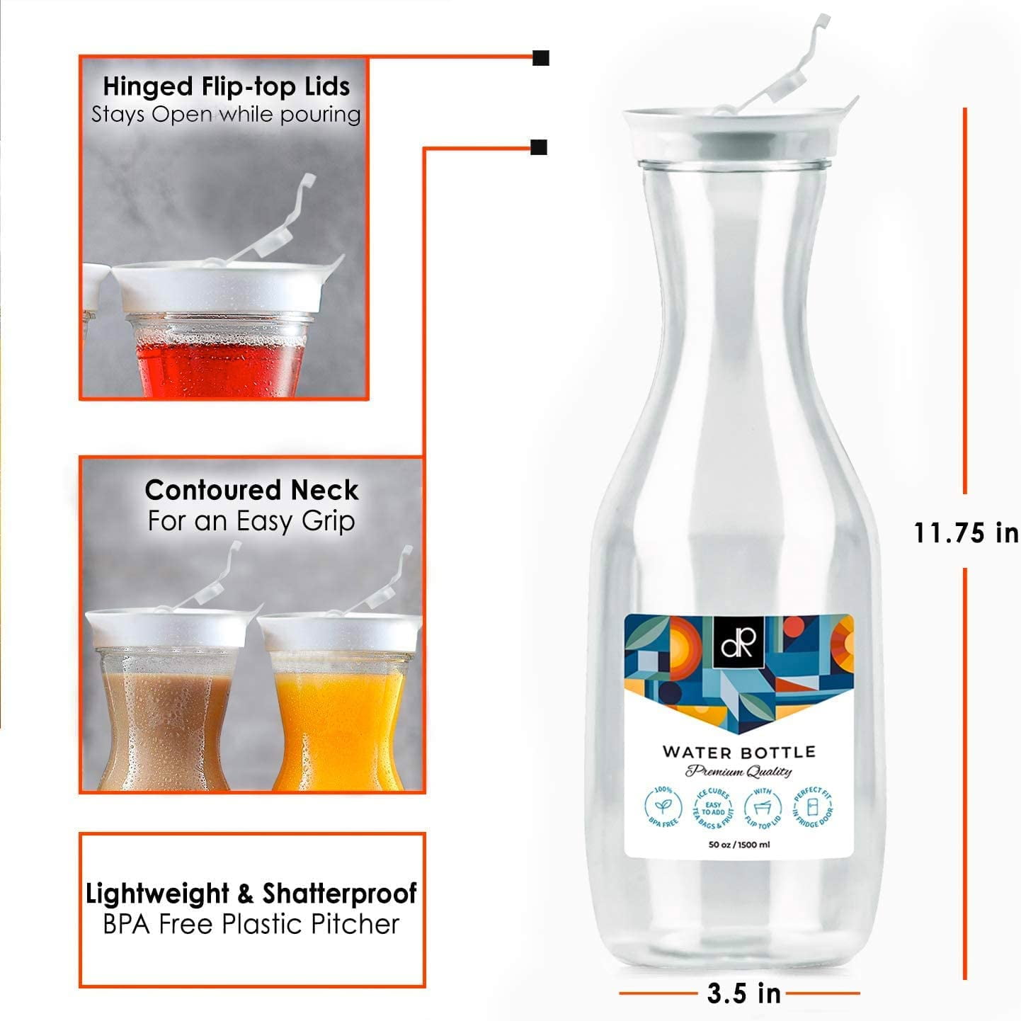 DecorRack 4 Large Water Carafes. Bottles with Flip Top Lid, 50 Oz Each. BPA Free Plastic Juice Pitcher, Decanter, Jug. NOT DISHWASHER SAFE