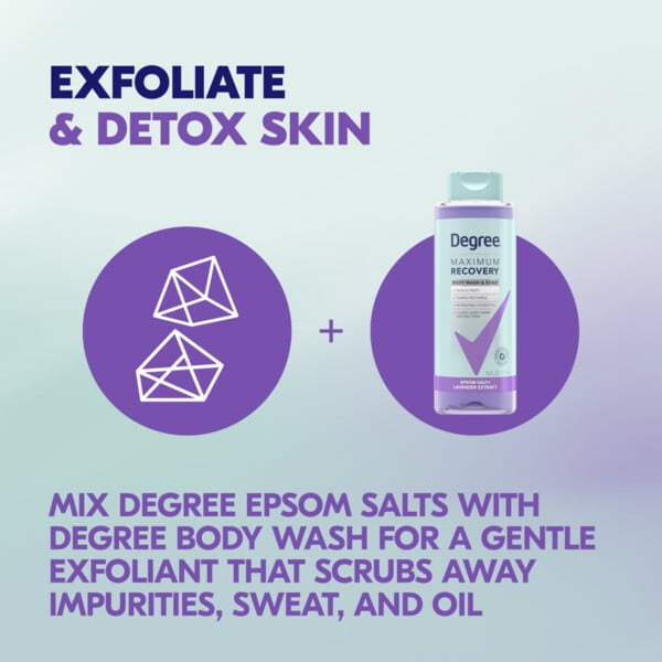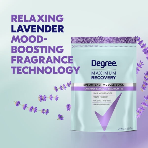 Soak your way to post-workout recovery with Degree Maximum Recovery Lavender Epsom Salt Muscle Soak. It is the perfect way to revive tired muscles and help you reset post-sweat. Whether you had a demanding day at work, chased after the kids, or had an intense workout, Degree Epsom Salt Muscle Soak, with electrolytes and Lavender extract, harnesses the power of hot water to ease muscle aches after a workout. To use, fill the bathtub with warm water and add one to two cups of bath salt. Soak for at least 15 minutes to experience our relaxing Lavender mood-boosting fragrance technology. Want to create a full post-workout skincare routine? Pair Degree Maximum Recovery Muscle Soak with our Maximum Recovery Body Wash to exfoliate and detox your skin. Start by mixing a handful of bath salts with your body wash and gently massage onto your body to exfoliate away any impurities, sweat, or oil. Whatever you do, however you do it, Degree wants to help inspire the confidence in you to move more, and this Epsom salt muscle soak gives you the power to keep moving. Be sure to try our range of Degree Maximum Recovery shower and bath products. Degree Maximum Recovery won’t let you down.