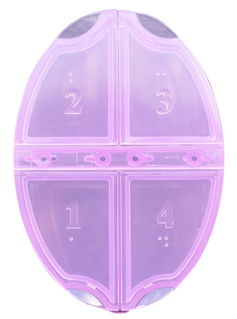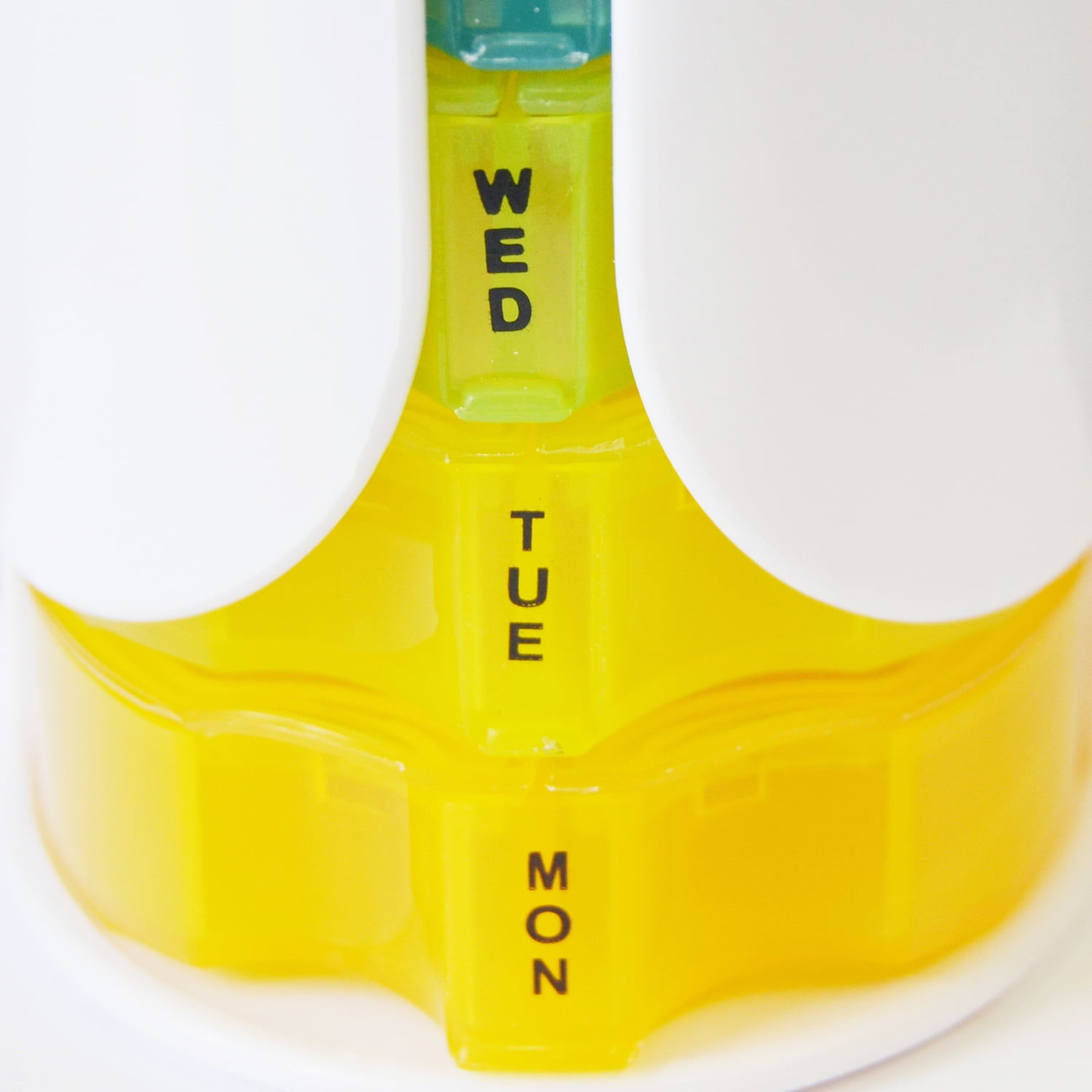 - PILL ORGANIZER: For those who only need a small capacity 7 Day pillbox solution, this 7X4 weekly pill organizer set includes 7 pillboxes labeled MON, TUE, WED, THU, FRI, SAT, SUN. Each of the 7 pillboxes has 4 compartments. The capacity of each compartment (4 per pillbox) is 18 Aspirin-sized pills.