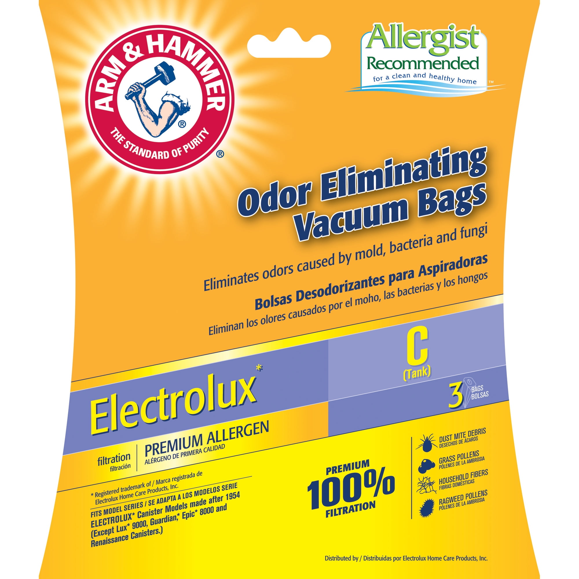Arm & Hammer Electrolux Style C Premium Allergen Vacuum Bags help capture household dust, dirt, and debris while Arm & Hammer Baking Soda neutralizes odors as you vacuum. Fits vacuum cleaner models/series: ELECTROLUX* Canister Models made after 1954 except Lux* 9000, Guardian*, Epic* 8000 and Renaissance* Canisters. Arm & Hammer Premium Allergen vacuum bags capture 90% of allergens at 1 micron or larger including pet dander, grass and ragweed pollen, househould fiber and dust mite debris.Electrolux Style C Premium Allergen Bag Pkg