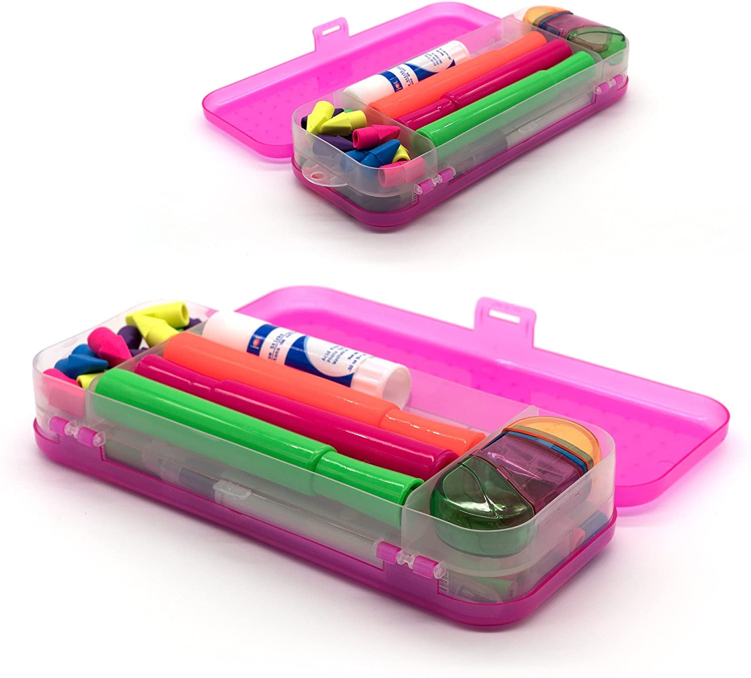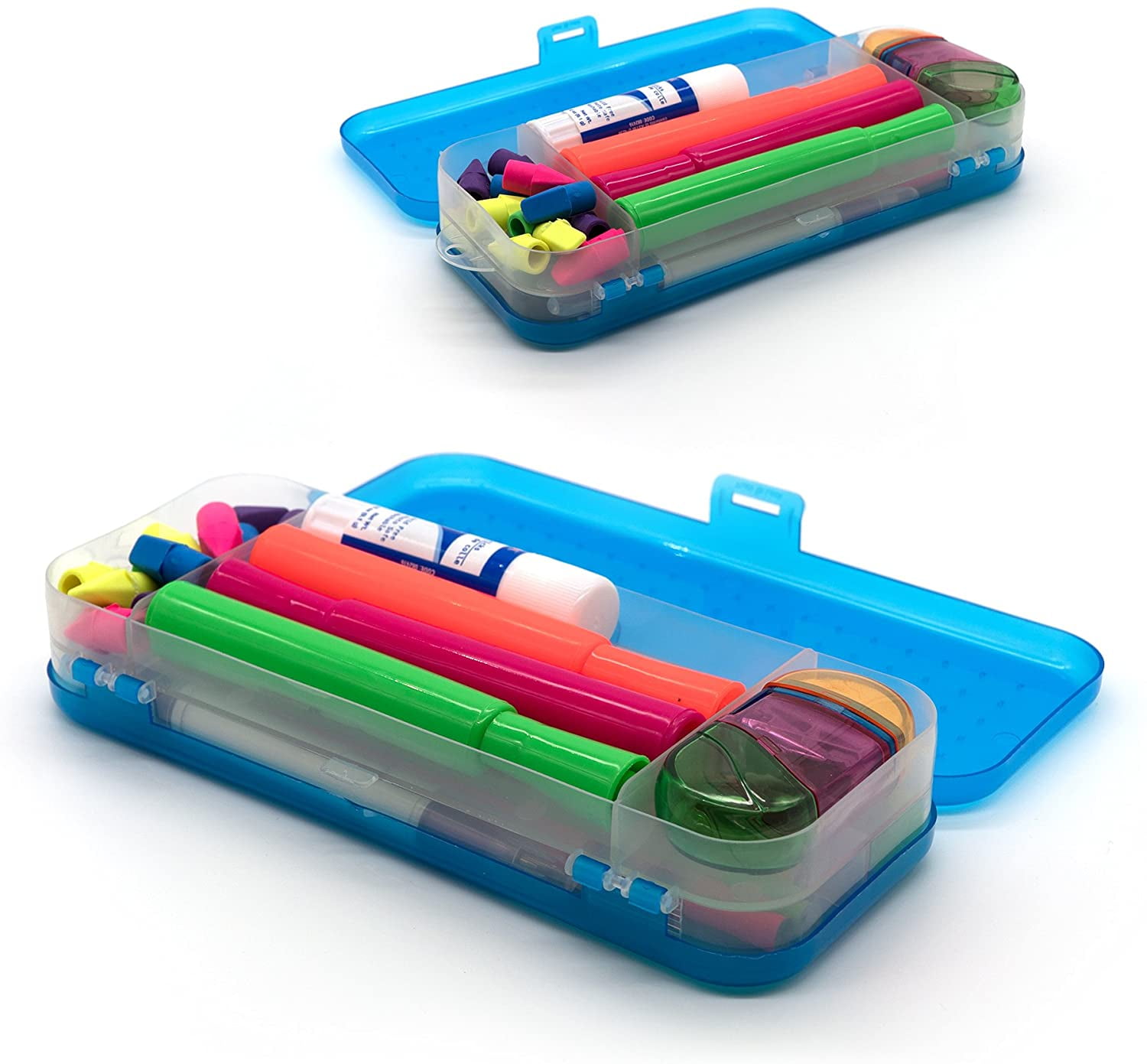 Emraw Bright Color Double Deck Organizer Box (6-Pack)(New) This Pencil box is great to hold pens, pencils, scissors, etc. pencil box is made of an impact resistant hard plastic and features an integrated snap latch. The Pencil Box is conveniently-sized to help students and teachers organize and transport school supplies. The tinted base and lid allow contents to be seen from any angle. The compact size makes it easy to slide into handbag or small bags.