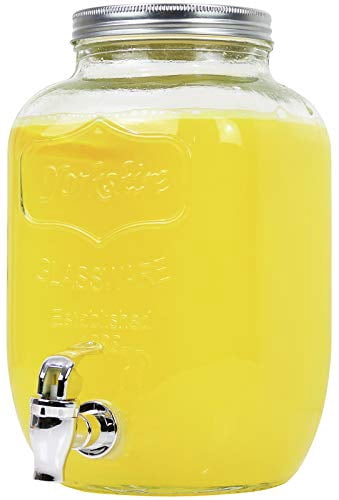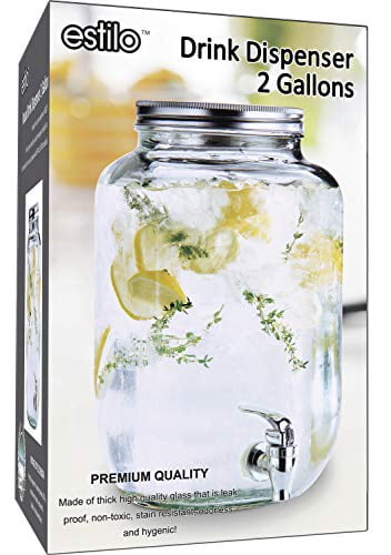 This mason jar glass drink dispenser will definitely make a great centerpiece and enhance your event, party etc.. Mason jar beverage drink dispenser with a tin screw off lid with a chromed tone easy to pull non-drip spigot. Dispenser holds up to 2 gallons. Dispenser dimensions in inches; 8" Diameter x 12.5" High. For best care hand wash only with soapy water. Not intended for hot liquids!.