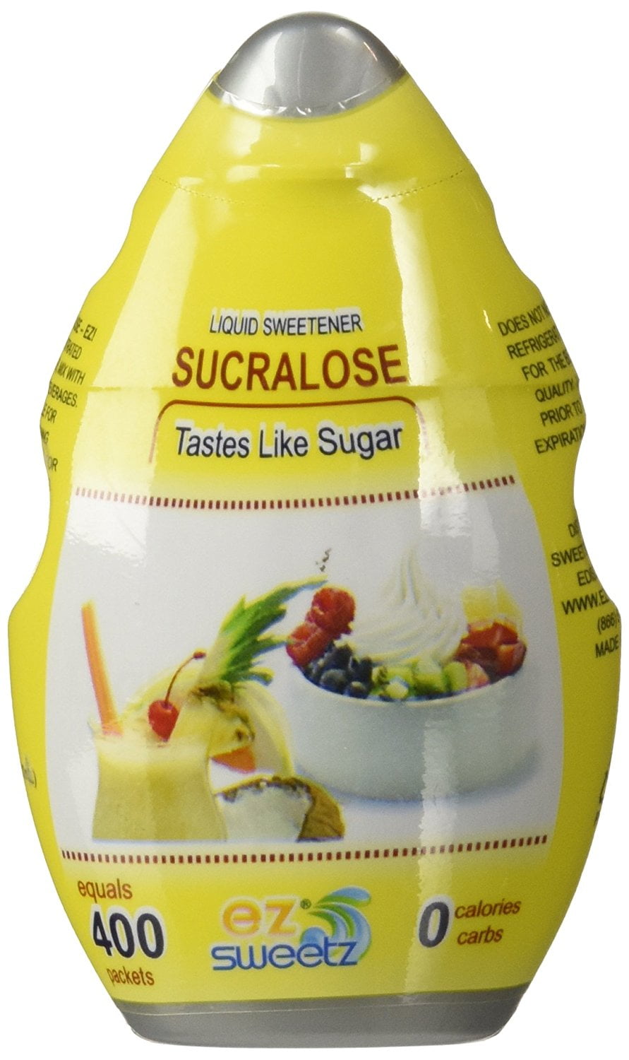 Zero calories, zero glycemic impact, zero aftertaste, and zero worriesSuitable for entire family including diabetics and promote weight controlCompared to Splenda® packets. Tastes like sugar, and is suitable for hot and cold foods2 drops per serving. Compact design offers a lot of servings. Saves up to 70% compared to Packets.Made in USAEZ-Sweetz is a 0-calorie, 0-carbohydrate liquid sweetener made from Sucralose–the same sweetener found in Splenda and other powdered sugar substitutes. However, unlike other sweeteners that are made up of 99% bulking materials, such as Maltodextrin and Dextrose which have no nutritional value but add calories and carbs, EZ-Sweetz has no filler. This means that it costs less than packets and that it won’t add unnecessary calories to your diet. And, thanks to its liquid form, it mixes easily into any hot or cold beverage and works well for baking and cooking. Conversion Chart: 2 Drop (1 Serving) = 2 Tsps of Sugar = 1 Splenda packet. A 1.05 oz bottle offers about 400 servings. Product is made in USA. Stay connected with us for the latest product news, recipes, and product sales: FACEBOOK: www.facebook.com/ezsweetz TWITTER: www.twitter.com/ezsweetz *Splenda is a trademark of McNeil Nutritionals, LLC.Zero calories, zero glycemic impact, zero aftertaste, and zero worriesSuitable for entire family including diabetics and promote weight controlCompared to Splenda packets. Tastes like sugar, and is suitable for hot and cold foods2 drops per serving. Compact design offers a lot of servings. Saves up to 70% compared to Packets.Made in USA