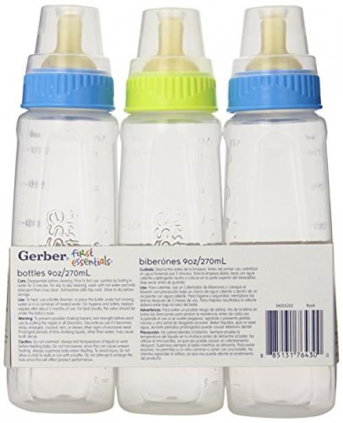 Gerber First Essential Clear View Plastic Nurser With Latex Nipple, BPA Free, Assorted Colors, 3 PackGerber® First Essentials® 4+m Medium Bottles.