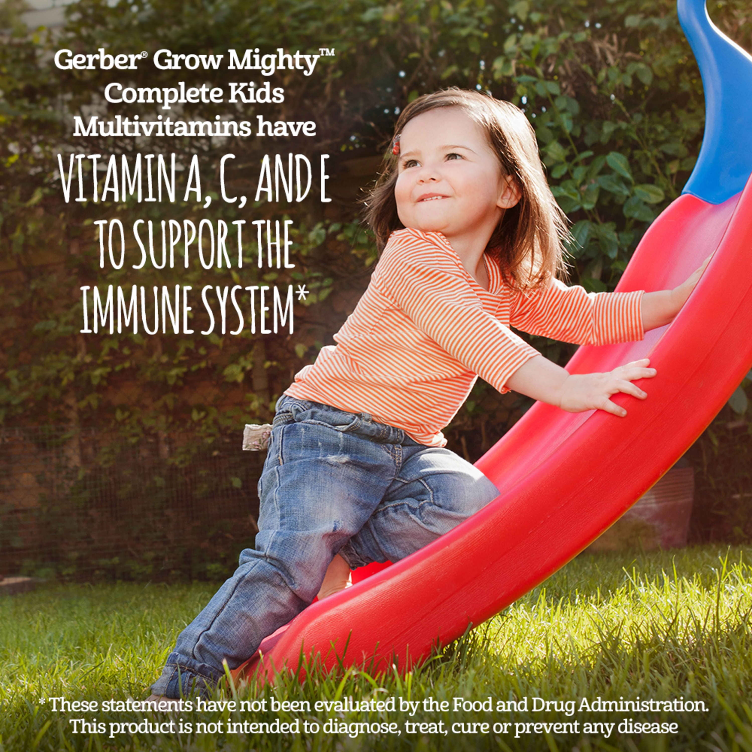 Complement your little one’s diet with nutrients they don’t get enough of from diet alone with Gerber Grow Mighty Complete Kids Multivitamin. Backed by the Feeding Infants and Toddlers Study (FITS), this kids multivitamin gummy formula contains 15 essential nutrients to support your child’s healthy growth and development. The scientific blend of nutrients in this child multivitamin includes vitamins C, D3, E, B vitamins and choline, and it helps your little one to meet 100% of the daily value of vitamins D and E. Pediatrician endorsed, this gummy multivitamin dietary supplement is free of gluten, artificial flavors and synthetic colors plus it has no peanut, dairy or gelatin ingredients to meet your preferences. Cherry, grape, orange and strawberry flavors make these multi vitamin gummies delicious and easy to enjoy. To support your child’s development, use 2 multivitamin gummies daily for ages 2 to 3 years and 3 vitamin gummies for ages 4 years and up.