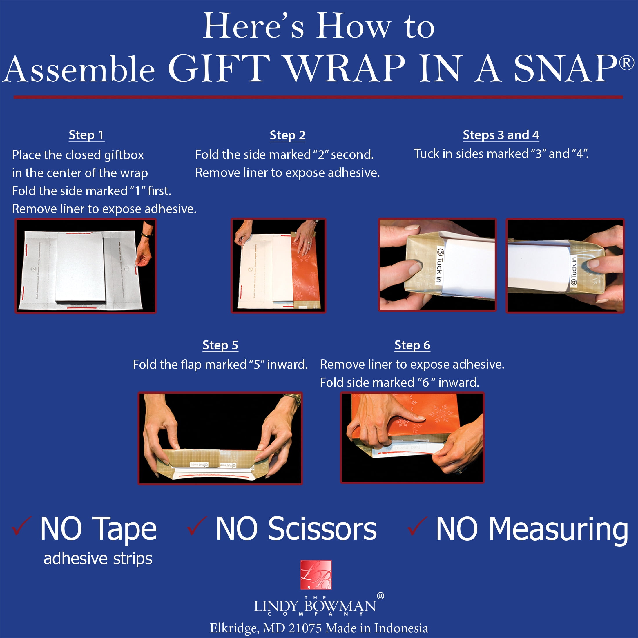- Each gift wrap paper sheet is printed on one side with attractive and appealing holiday-themed art, while the back side of the holiday wrapping paper sheet has step-by-step instructions for quick and easy gift wrapping
