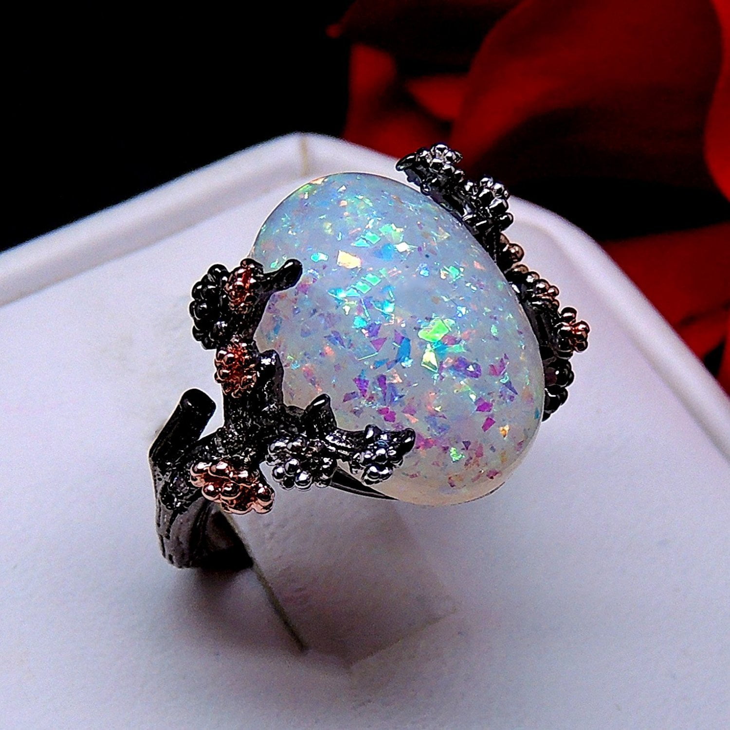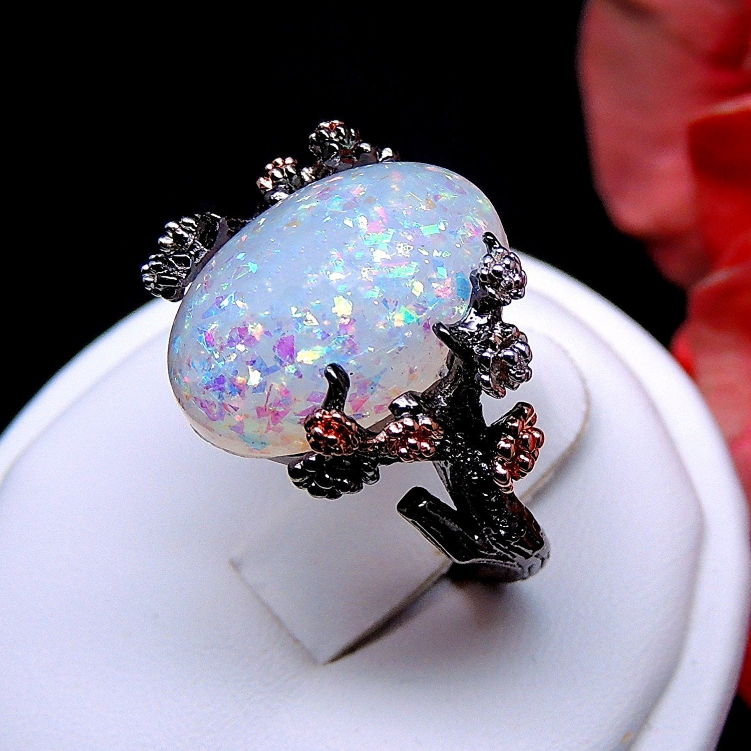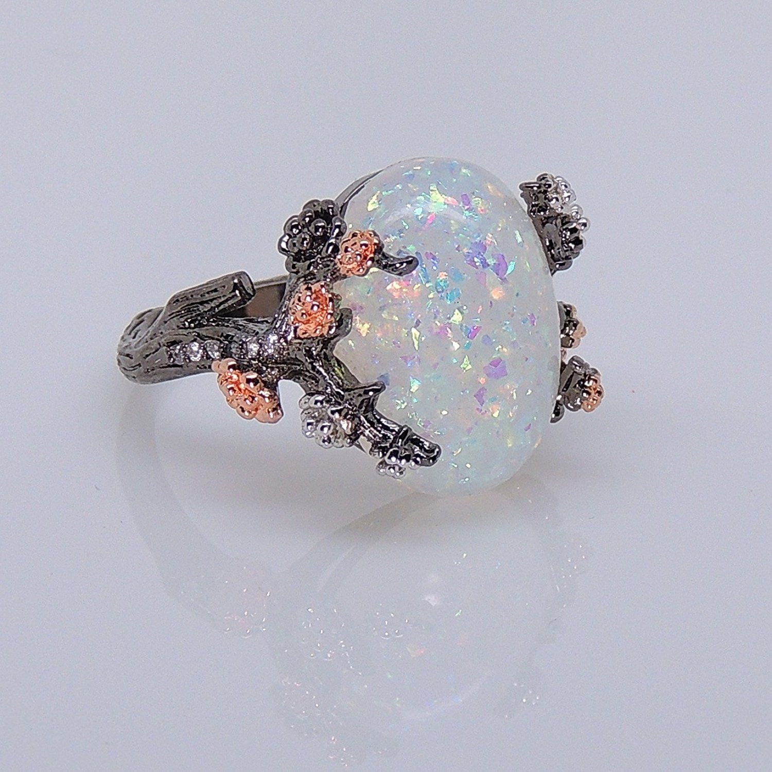 Henrietta Enchanted Tree Branch Flower Ring Unique Fairy Elven Moon Oval Simulated Fire Opal Black Cubic Zirconia CZ Gold Plated Fun Costume Jewelry Engagement Ring Choice of Simulated Opal Stone in White Purple or Green or our Acro Stone With Green Blue Gold and Silver Foil Flakes in Purple Green Red or Black Stone. All Stones are handmade so there will be a difference in the flakes in each of them No two are exactly alike. Stone Size: 17mmx12mm Metal: Copper Plating Black (Rose Gold on Flowers) Stone CZ + Simulated Opal or Acro Stone Great Promise Rings For Teen girls Vintage Opal Look Gift Idea for any occasion Valentine’s Day Christmas Friendship Ring or Proposal Engagement Rings for Women