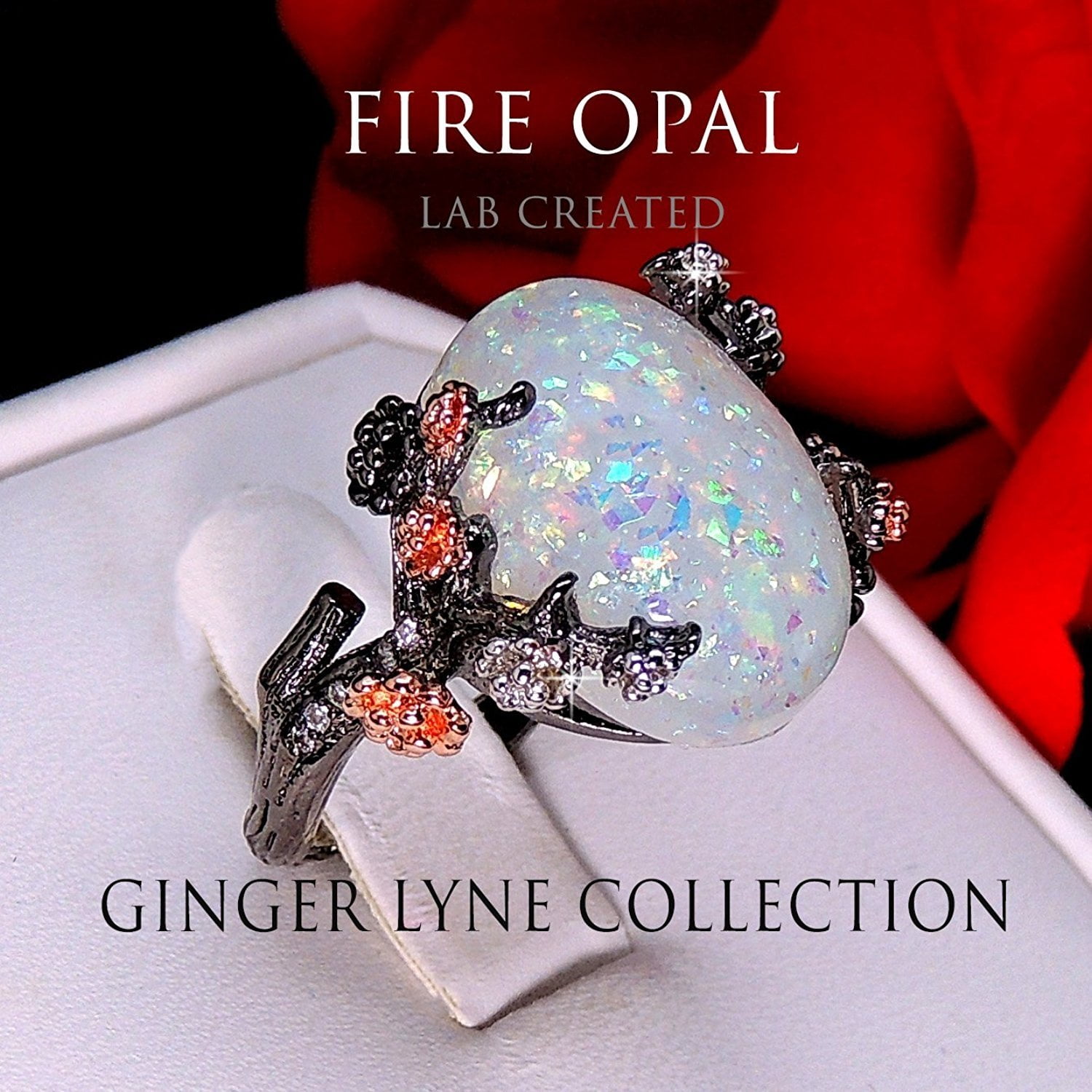 - HENRIETTA – Tree Branch Flower Vintage Fashion Ring Simulated Opal Black Plated by the Ginger Lyne Collection