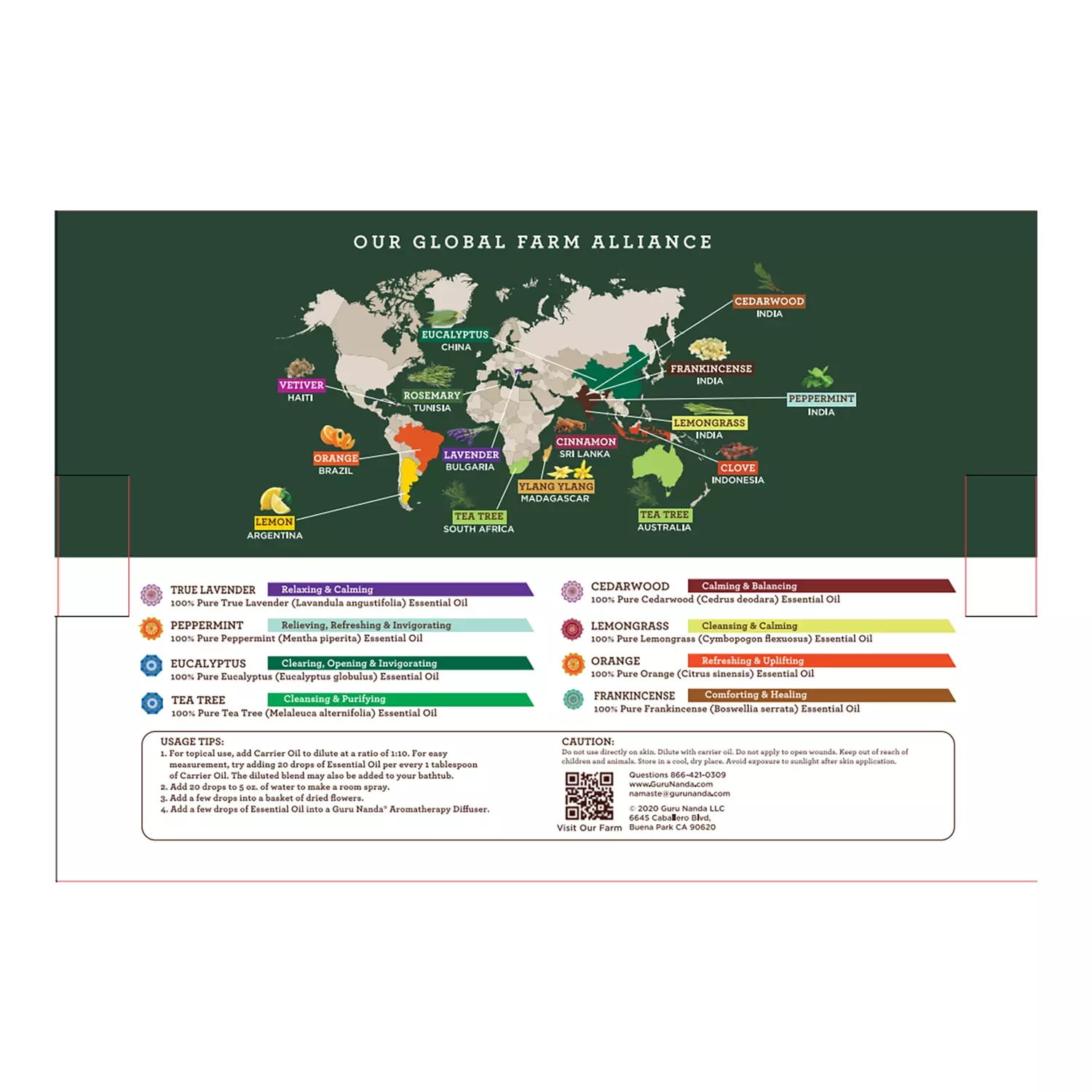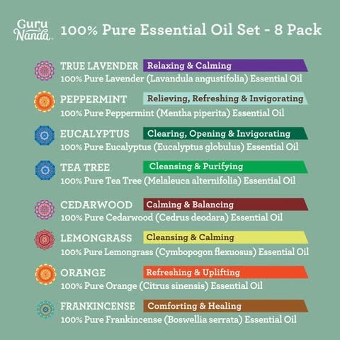 - Lavender, Peppermint, Eucalyptus, Orange, Lemongrass, Cedarwood, Tea Tree and Frankincense