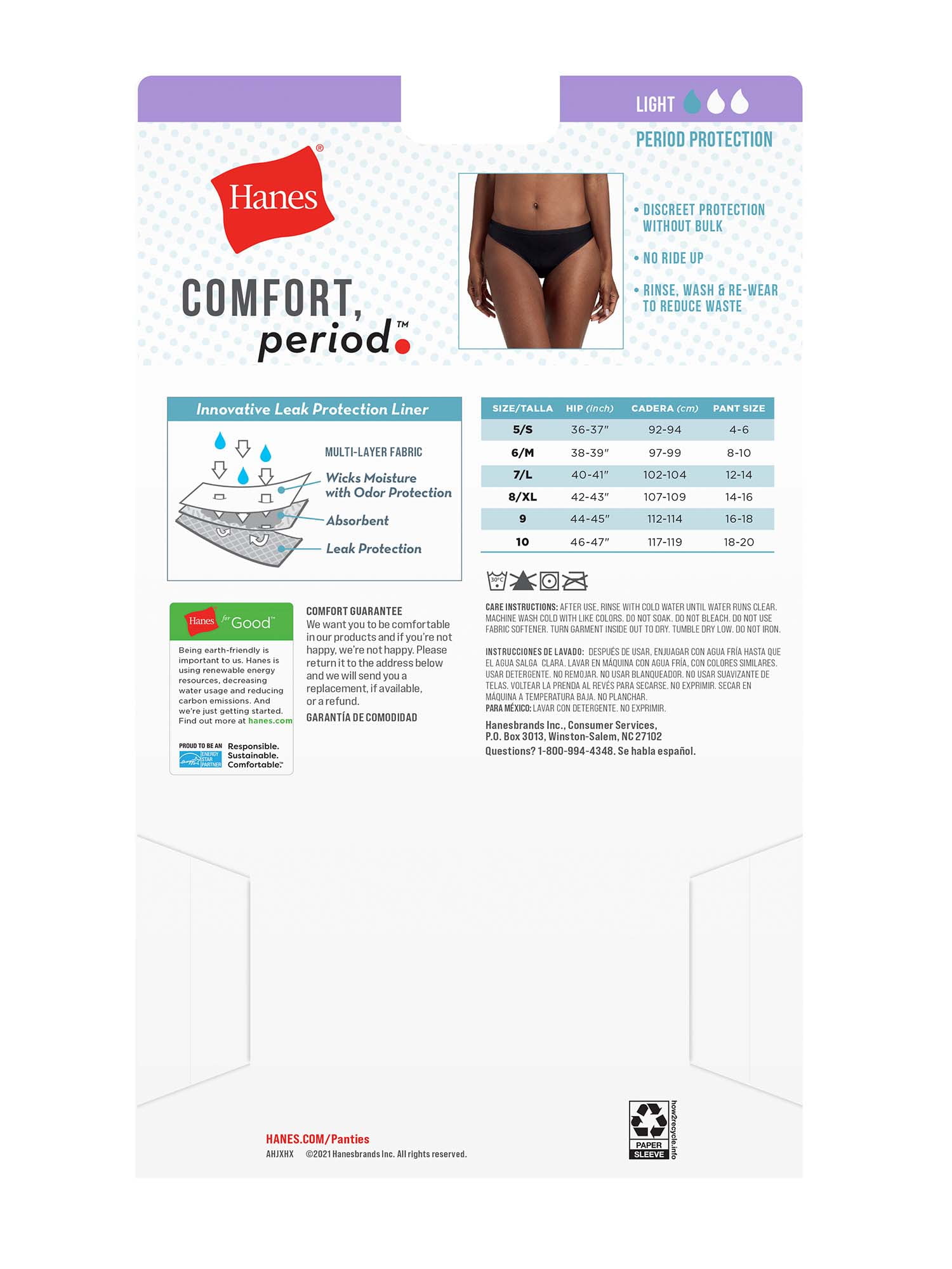 Hanes Women’s Comfort Period, Light Leak Protection Bikini panties are designed to help you stay comfortable and confident during light or moderate periods, even when sleeping. Enjoy the freedom and confidence to go anywhere and do anything without worrying about leaks, odor, or bulk. Hanes Comfort, Period. offers personal protection for every body and delivers the ultimate in leak protection so you can always feel at ease.