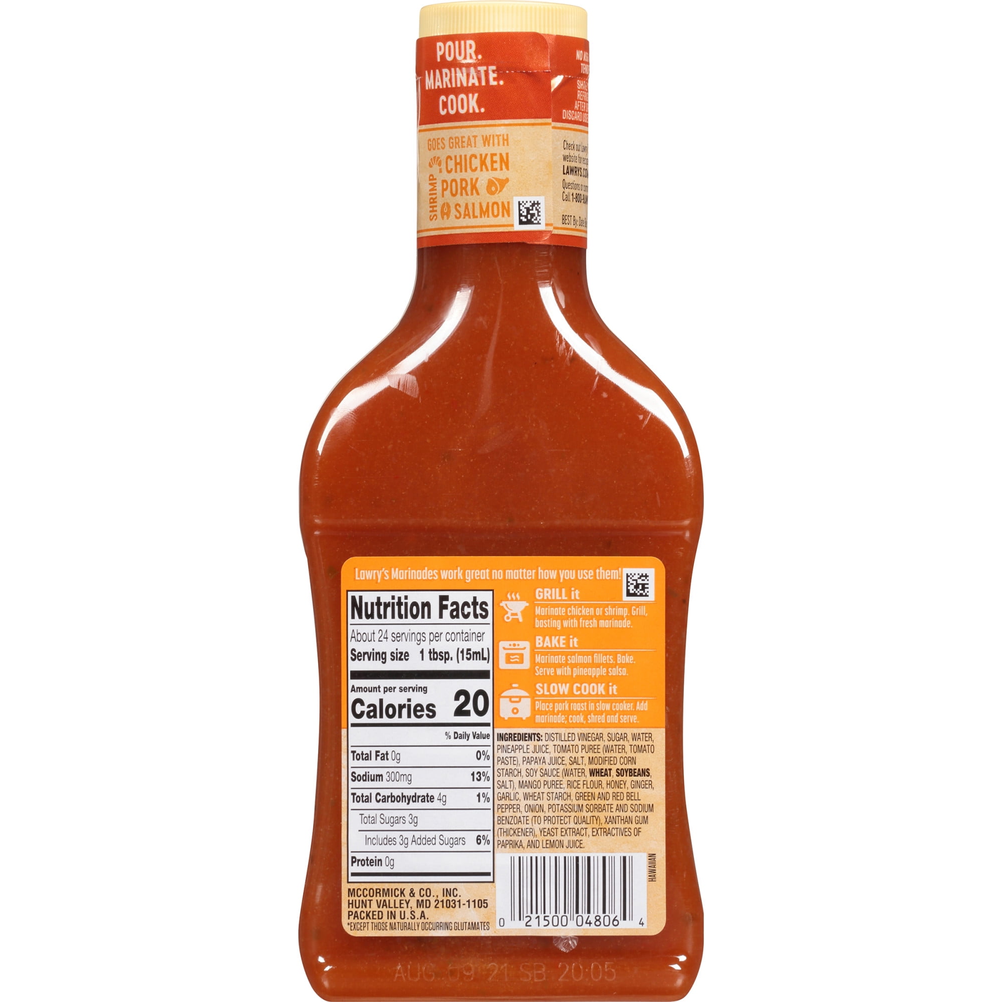 Lawry’s Hawaiian Marinade unlocks the flavor of the tropics with a mix of pure honey, soy sauce, ginger, real pineapple & papaya juices, and a hint of mango. Turn chicken, pork or fish into island sensations with this 15-minute marinade. Change up your dinner routine with fruity-sweet & savory tropical marinade. Use as a chicken marinade in our recipe for Chicken & Vegetable Skewers or as a seasoning for Tropical Slaw or Pineapple Salsa. Make these and other dishes in a snap – simply pour over meat, seafood or veggies, let stand for 15 minutes, then grill, bake, stir-fry or slow cook. Made with no high fructose corn syrup and no added MSG*, Hawaiian Marinade is an easy, breezy mealtime solution.*Except those naturally occurring glutamates.