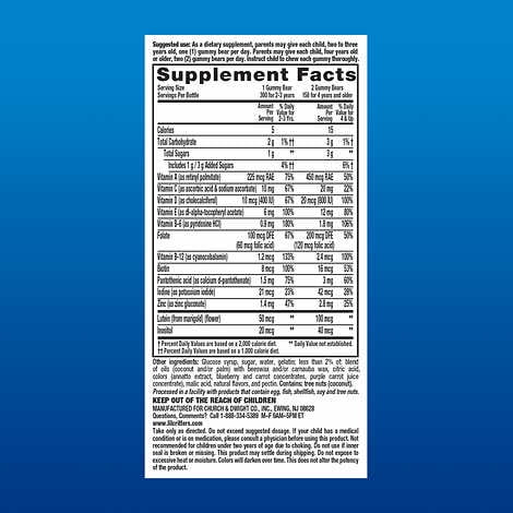 L’il Critters™, the #1 Kids Gummy Vitamin brand*, gives kids the building blocks they need to go on to do big things. It’s the gummy vitamin brand kids love and parents trust to help support and maintain healthy growth and development.†11 essential vitamins and mineralsNo high-fructose corn syrupNo glutenL’il Critters™ Gummy Vites does not use synthetic (FD&C) dyes such as FD&C Red #40, Blue #1, or Yellow #6*Based on 52 week Unit Sales, Nielsen All Outlet Data, through January 2018Suggested Use: As a dietary supplement, parents may give each child, two to three years old, one (1) gummy bear per day (Servings per bottle: 300). Parents may give each child, four years old or older, two (2) gummy bears per day. Instruct child to chew each gummy thoroughly.Servings Per Bottle: 150To ensure quality and potency through expiration, this dietary supplement is manufactured with higher active ingredient levels than the indicated Amount Per Serving. Take only as directed. Do not exceed suggested dosage. If your child has a medical condition or is on medication, please consult a physician before using this product. Not recommended for children under two years of age due to choking. An individual’s need for this product may be met through a varied and well balanced diet. Do not use if inner seal is broken or missing. This product may settle during shipping. Do not expose to excessive heat or moisture. Colors will darken over time. This does not alter the potency of the product. KEEP OUT OF REACH OF CHILDREN.About L’il CrittersL’il Critters™, the #1 Kids Gummy Vitamin brand*, has been infusing fun into children’s nutrition with its full line of delicious kids’ gummy vitamins and supplements since 1998. Treat your children to a tasty, healthy vitamin without any chalky aftertastes or hard-to-swallow pills.L’il Critters™ is powered by vitafusion™and benefits from sophisticated laboratory testing before their products arrive on the shelf. Give your children a healthy gummy vitamin today! We Make Nutrition Taste Good.™*Based on 52 weeks Unit Sales, Nielsen All Outlet Data, through January 2018
