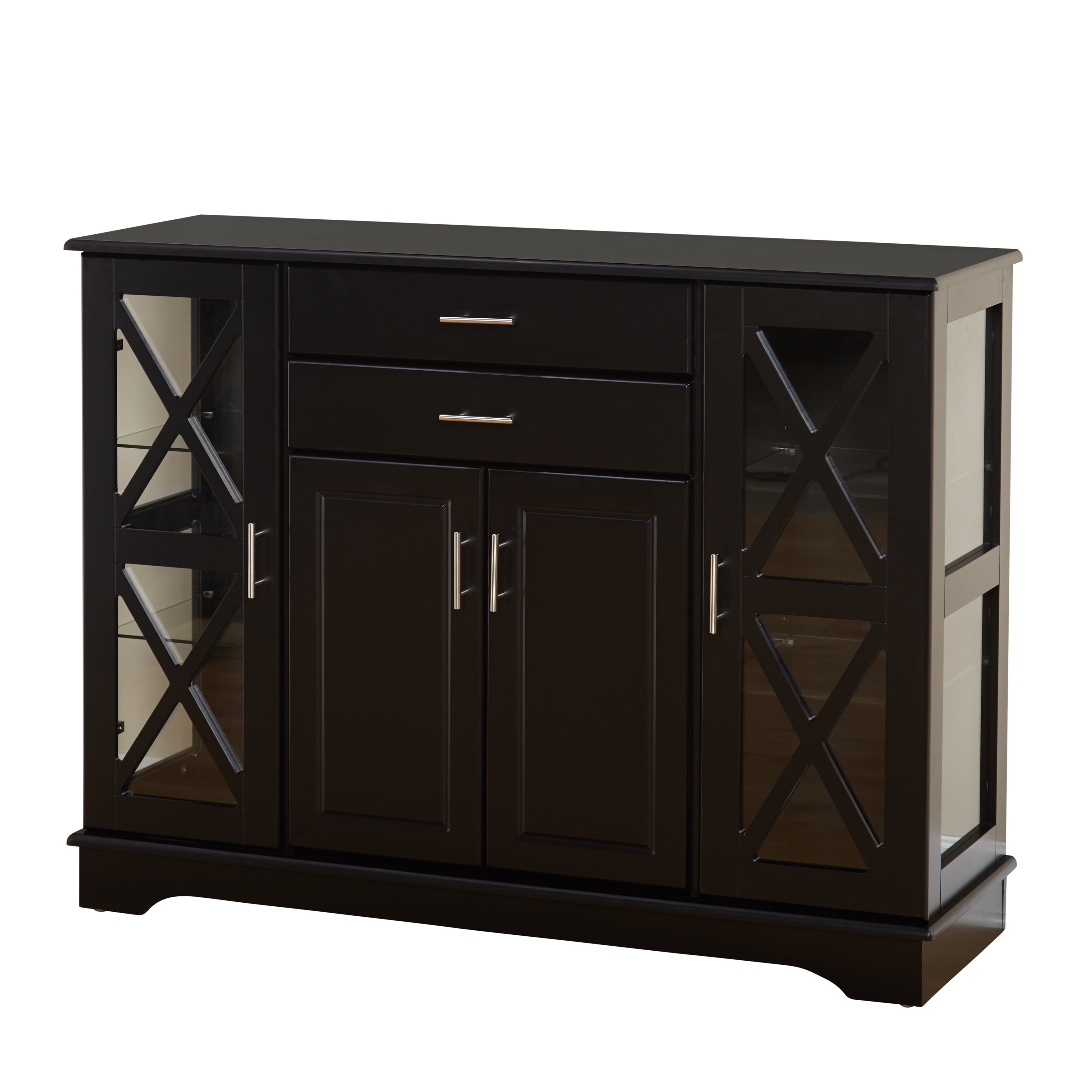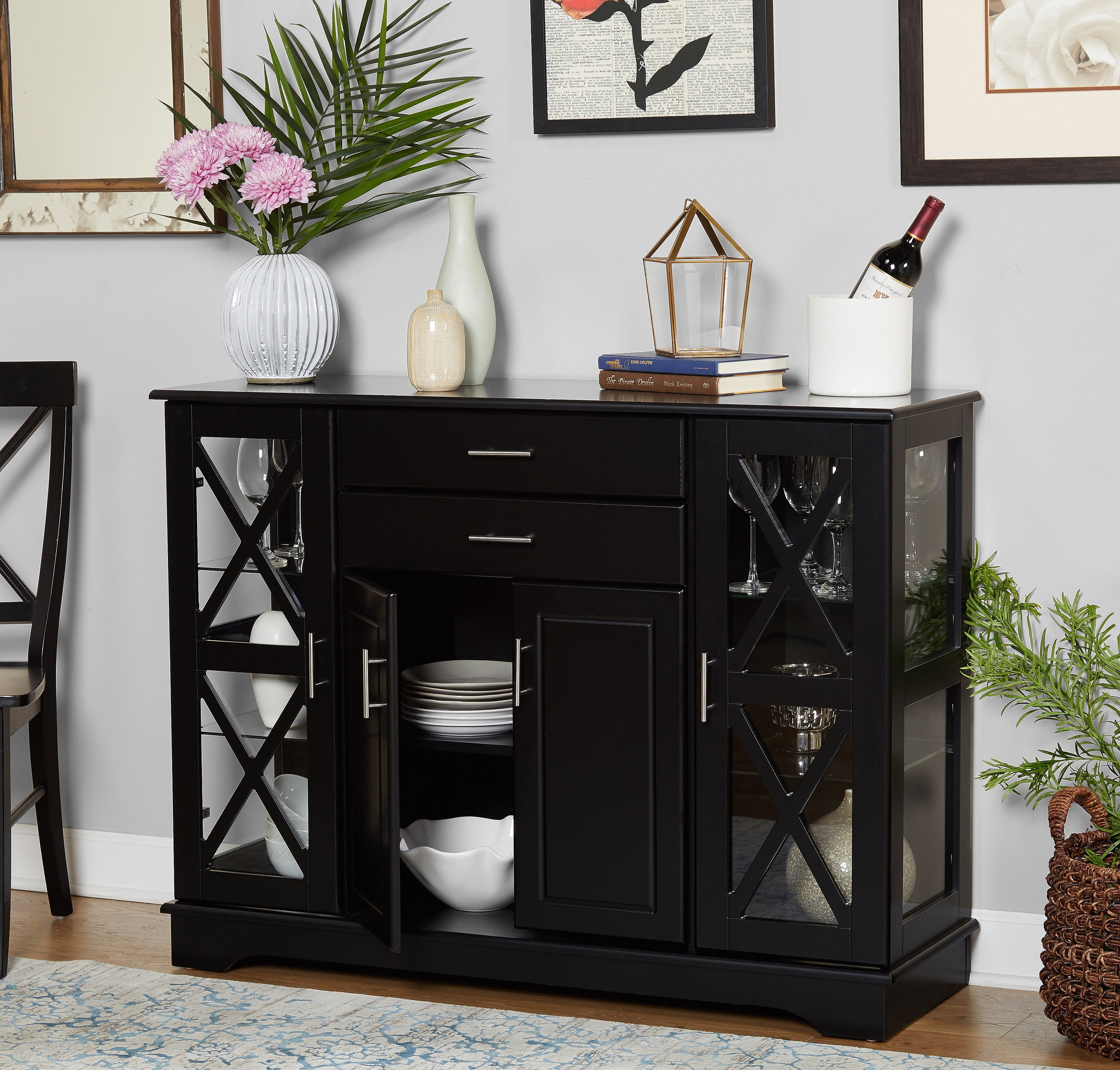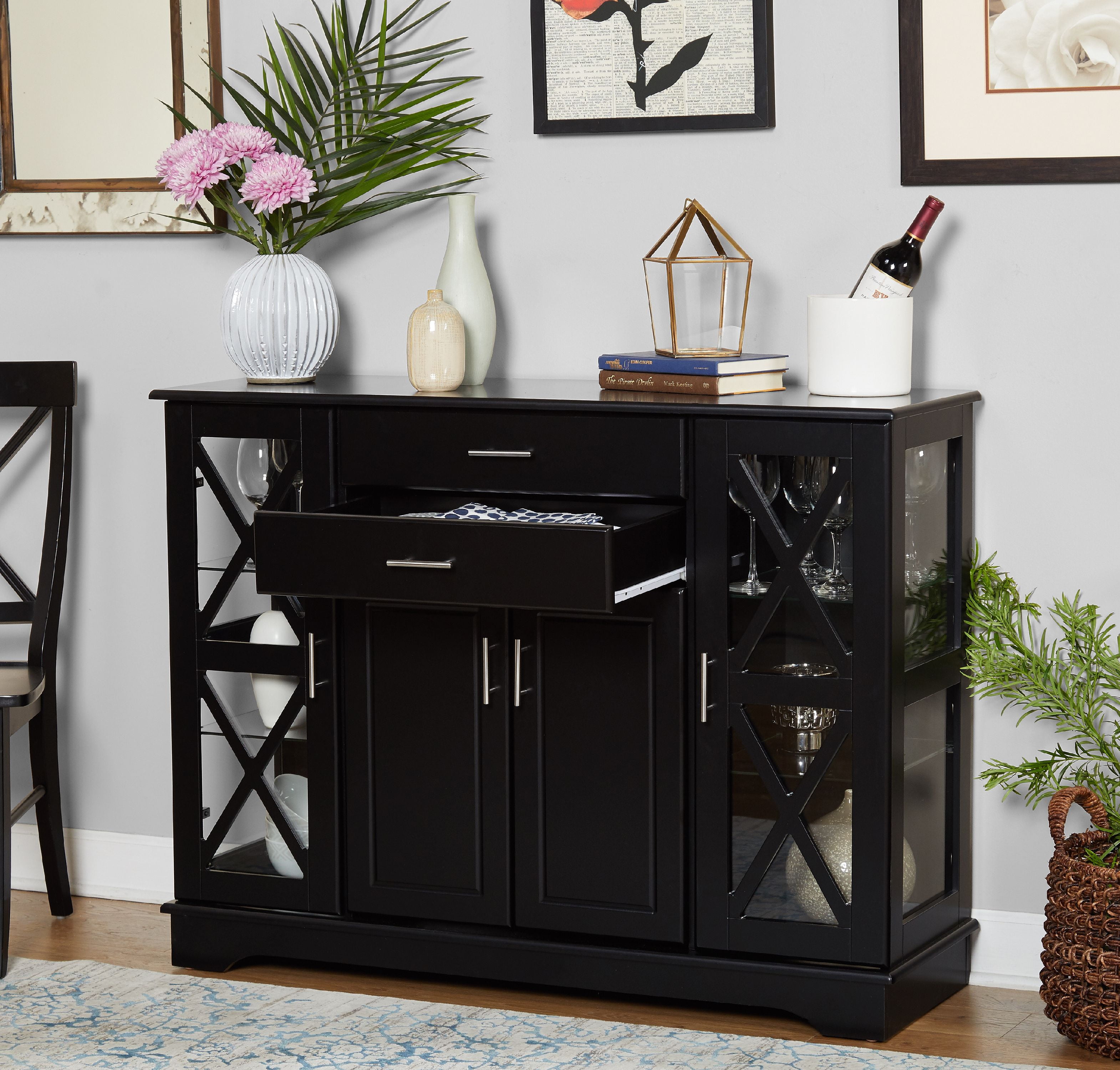 Have all of your entertaining essentials at your fingertips with the Buffet. This bold, contemporary buffet is functional and visually stunning. Tempered glass doors and sides allow your collections or glassware to see the light of day. Within each side of the cabinet you’ll find an adjustable glass shelf so you can create a custom storage configuration. Two solid doors at the center open onto one adjustable shelf. Two utility drawers allow you to organize small essentials.