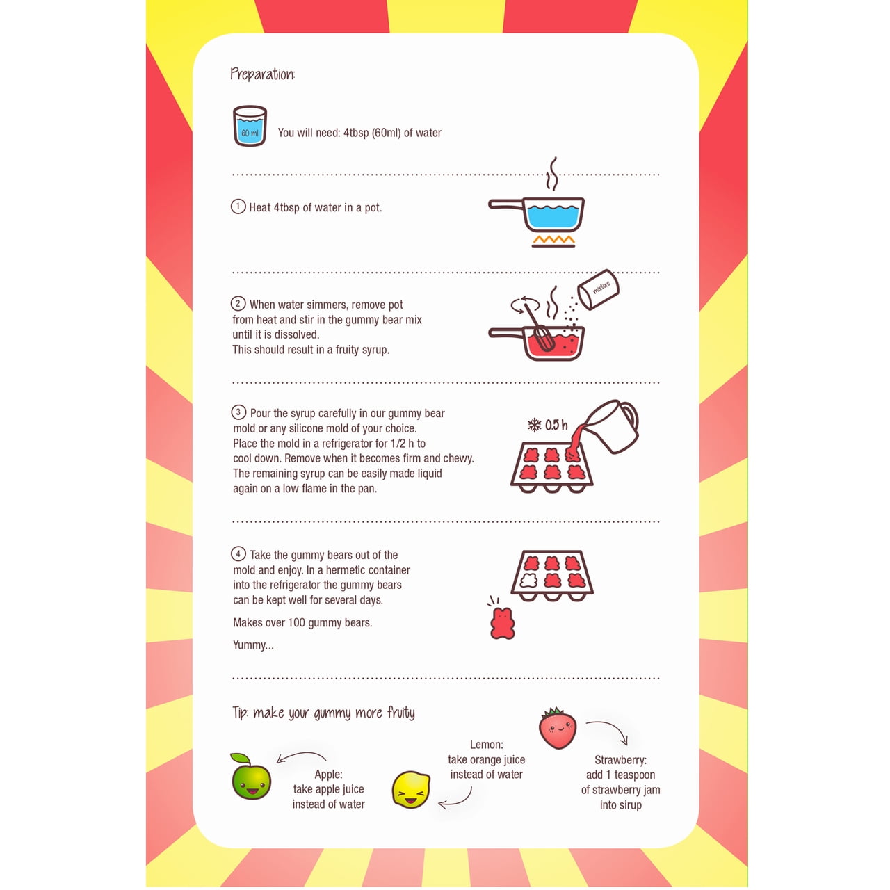 - 6 base mixes with natural flavors – Lemon (yellow), Strawberry (red), Apple (green). GMO free