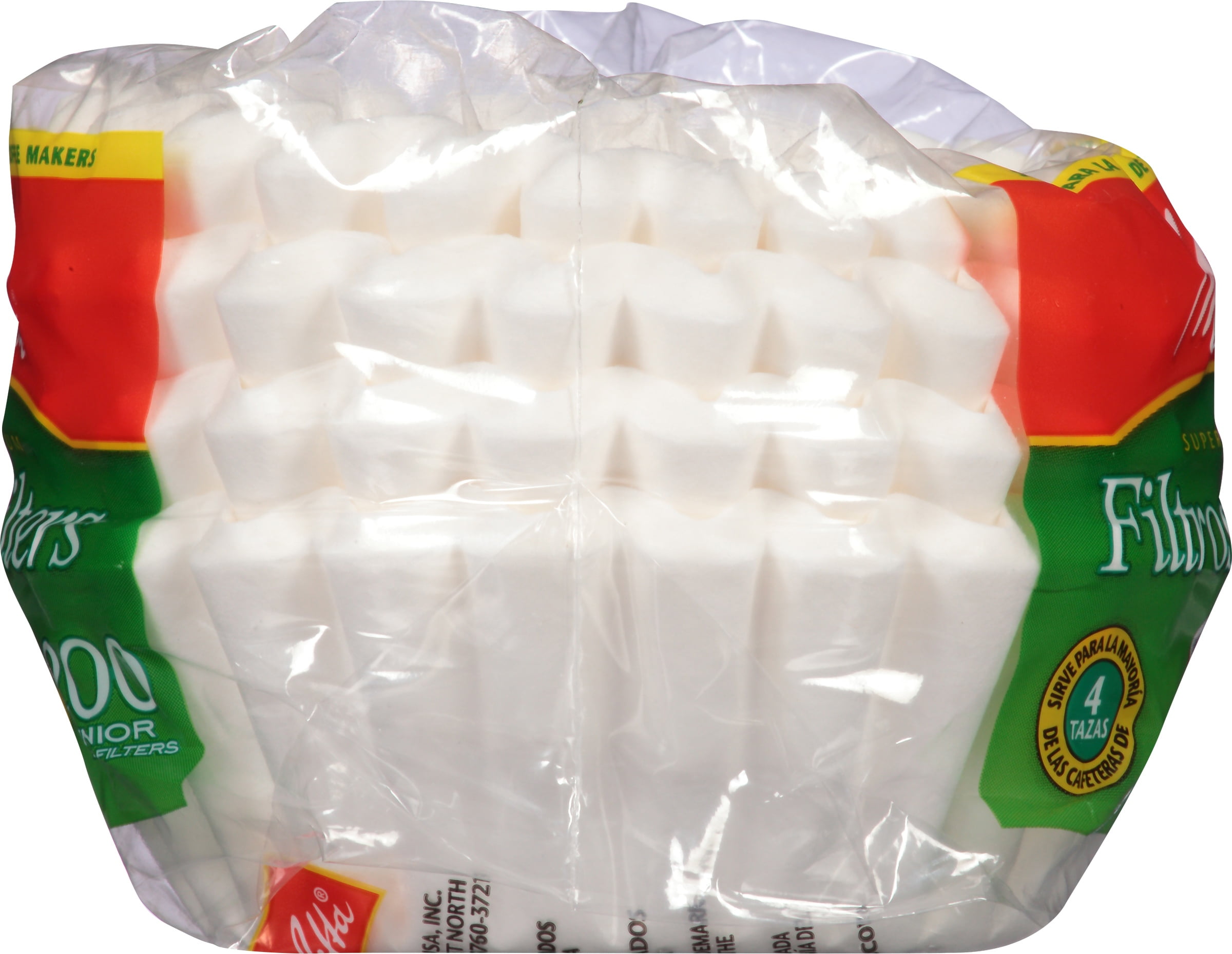 200 Ct Junior White Basket Coffee Filter 4-6 Cup White Basket Filter. Melitta cone filters are made with only oxygen cleansed paper and designed with a 2nd safety crimp for strength and durability, guaranteed not to burst.