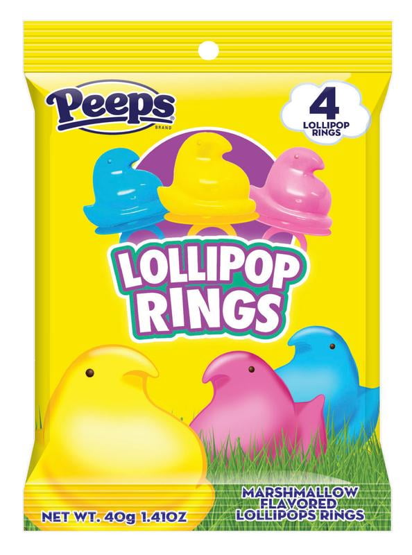 Peeps 4pk Lollipop Rings are a great basket stuffer item! Each bag comes with 4 lollipop rings flavored like marshmallows and shaped like a Peeps Chick.