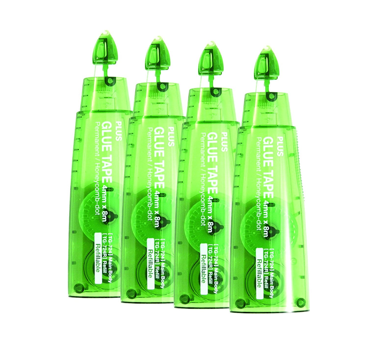 This glue tape is perfect for detailed gluing. The flexible head insures that the tape adheres firmly to the paper and honeycomb-dot pattern of the tape provides a clean cut. The pen-like shape fits comfortably in ones hand and the size makes it convenient to carry around. The applicator tool is refillable and the tape itself is double-sided and safe for use on photos.Plus Corporation Glue Tape Tg724R 3/16 Wide Adhesive, Refill 4Pack 60382
