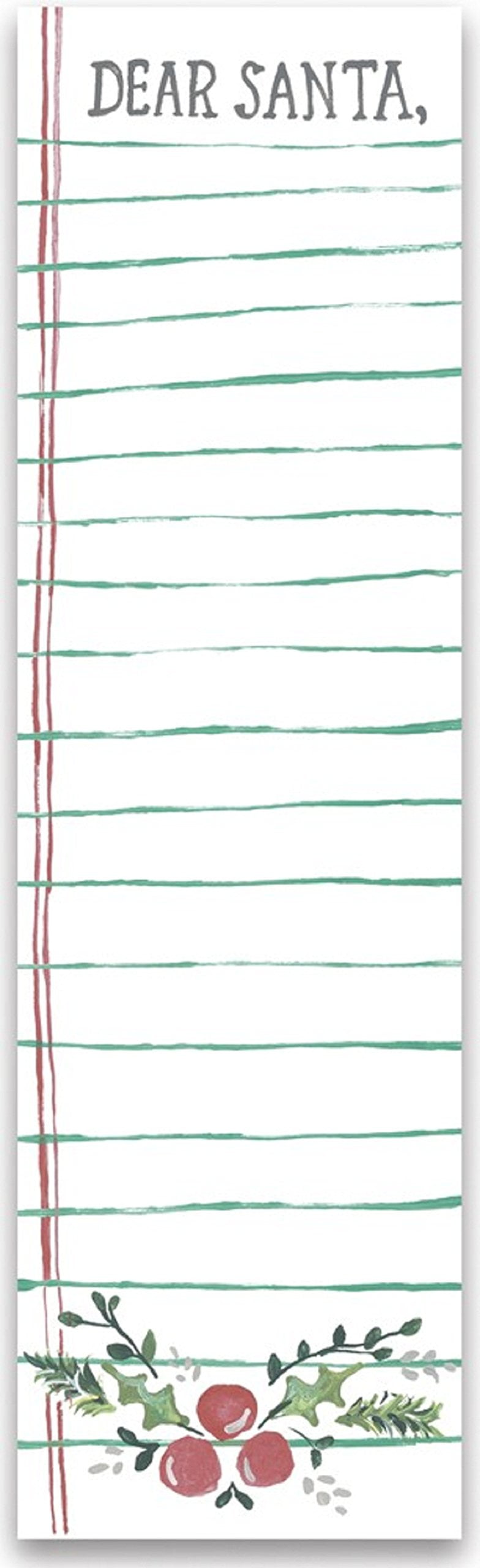 This cute and handy list notepad has a Christmas design on each page by artistAnnie Quigley. It has notebook lines sketched and holly berries at the bottom,and the top says "DEAR SANTA". There is a magnet on the back to stick this upon a fridge or other metal surface, and it has 60 pages. The back of each pagehas a sticky section near the top. Made by Primitives by Kathy, this measures2.75 by 9.5 inches.