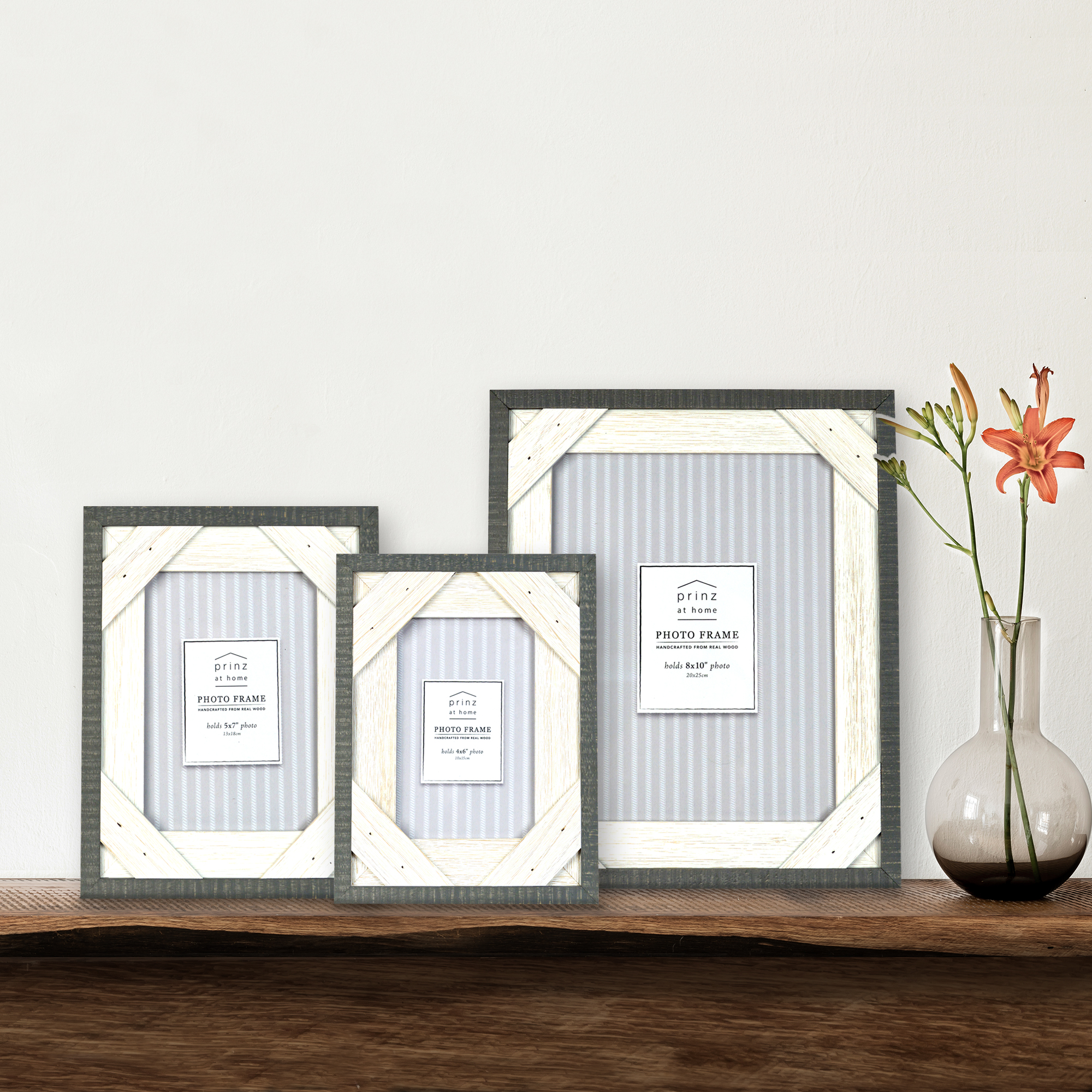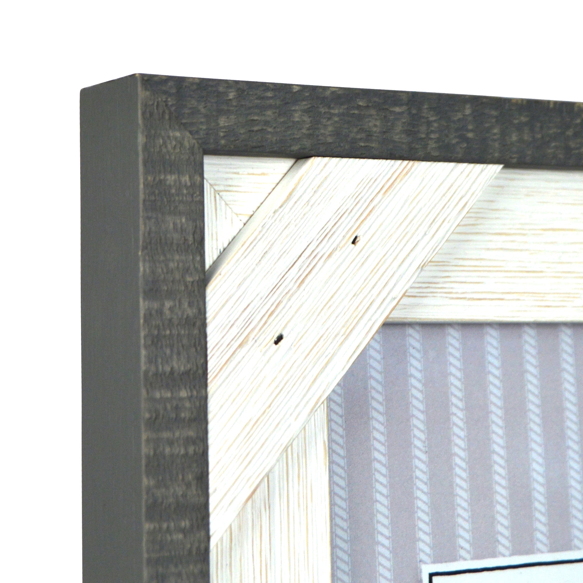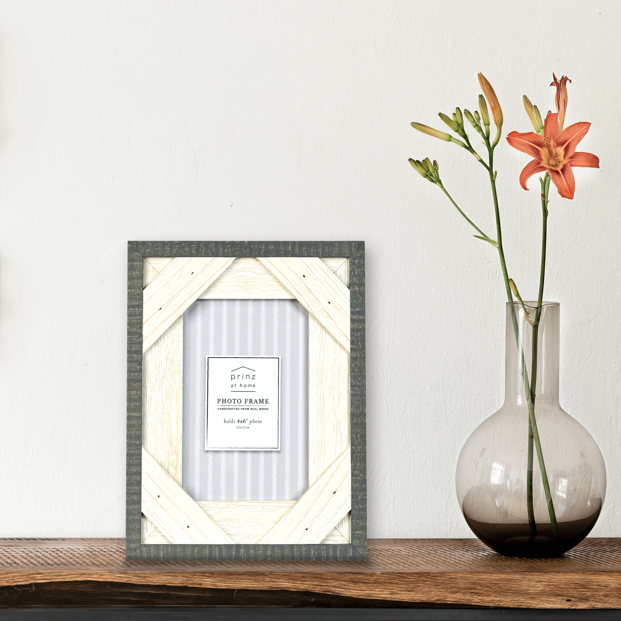 Reclaimed 4 x 6 Crosshatch Rustic Wood Picture Frame : Beautiful, crosshatch two-toned picture frame from our Reclaimed Collection is the perfect addition to any farmhouse or traditional home decor. Handcrafted from real FSC® certified wood, featuring a layered look in gray and whitewash finishes, and added dimension with corner slats, this frame will stylishly display your cherished photographs and memories. A study backboard, with easy opening tabs, keeps your photos firmly in place while the clear glass protects and preserves your photographs and prints.