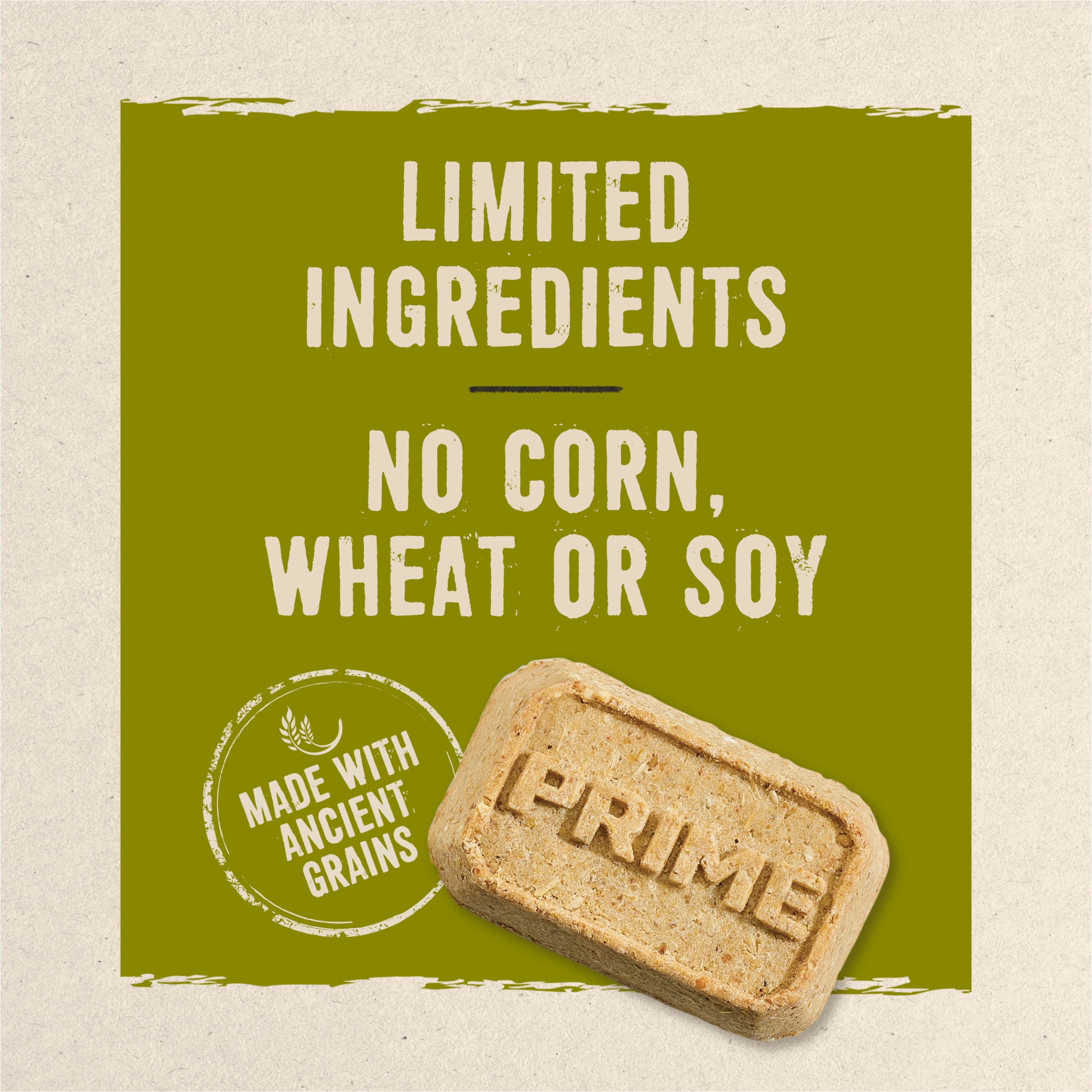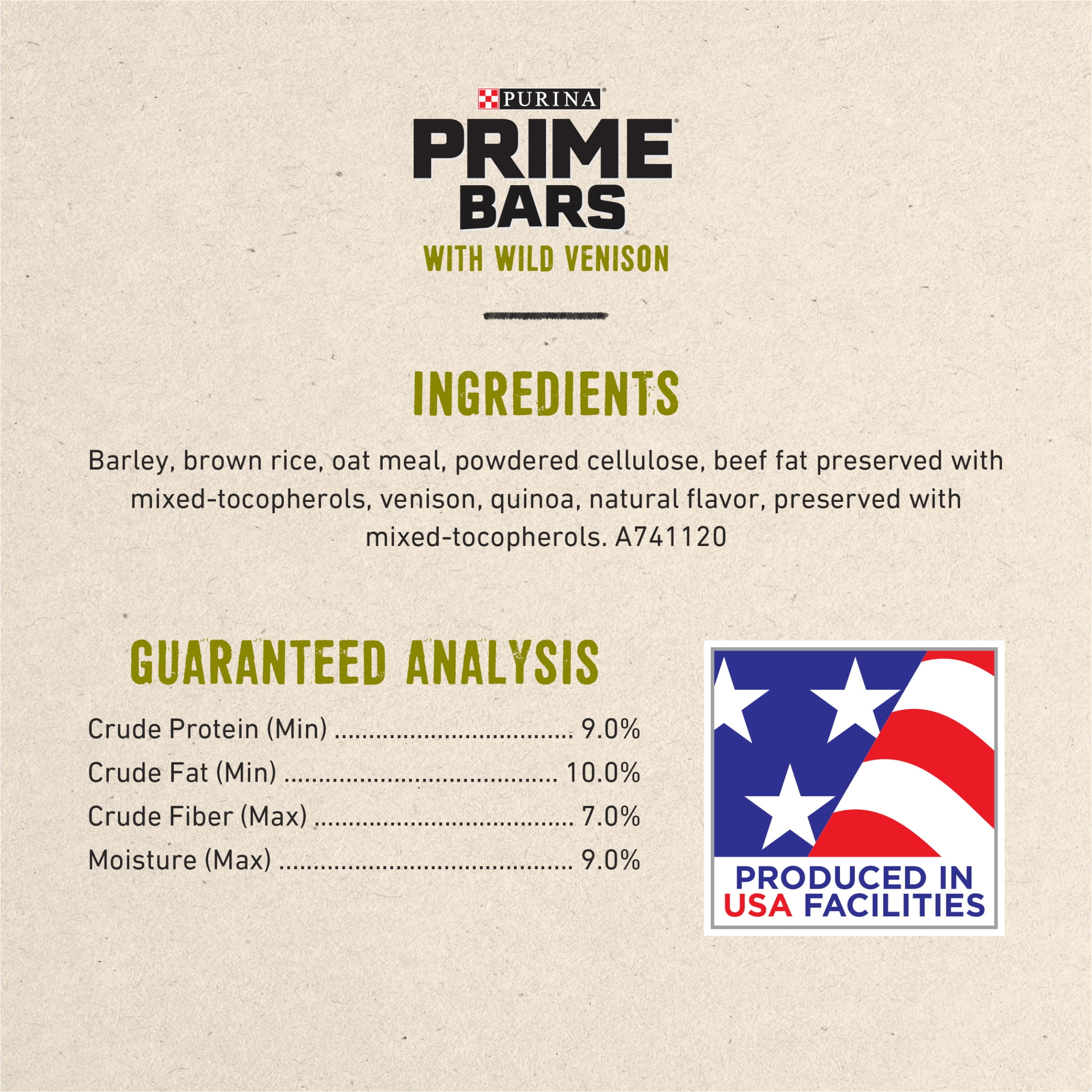 - Prime Bars natural dog biscuits are formulated with wild venison and made with ancient grains