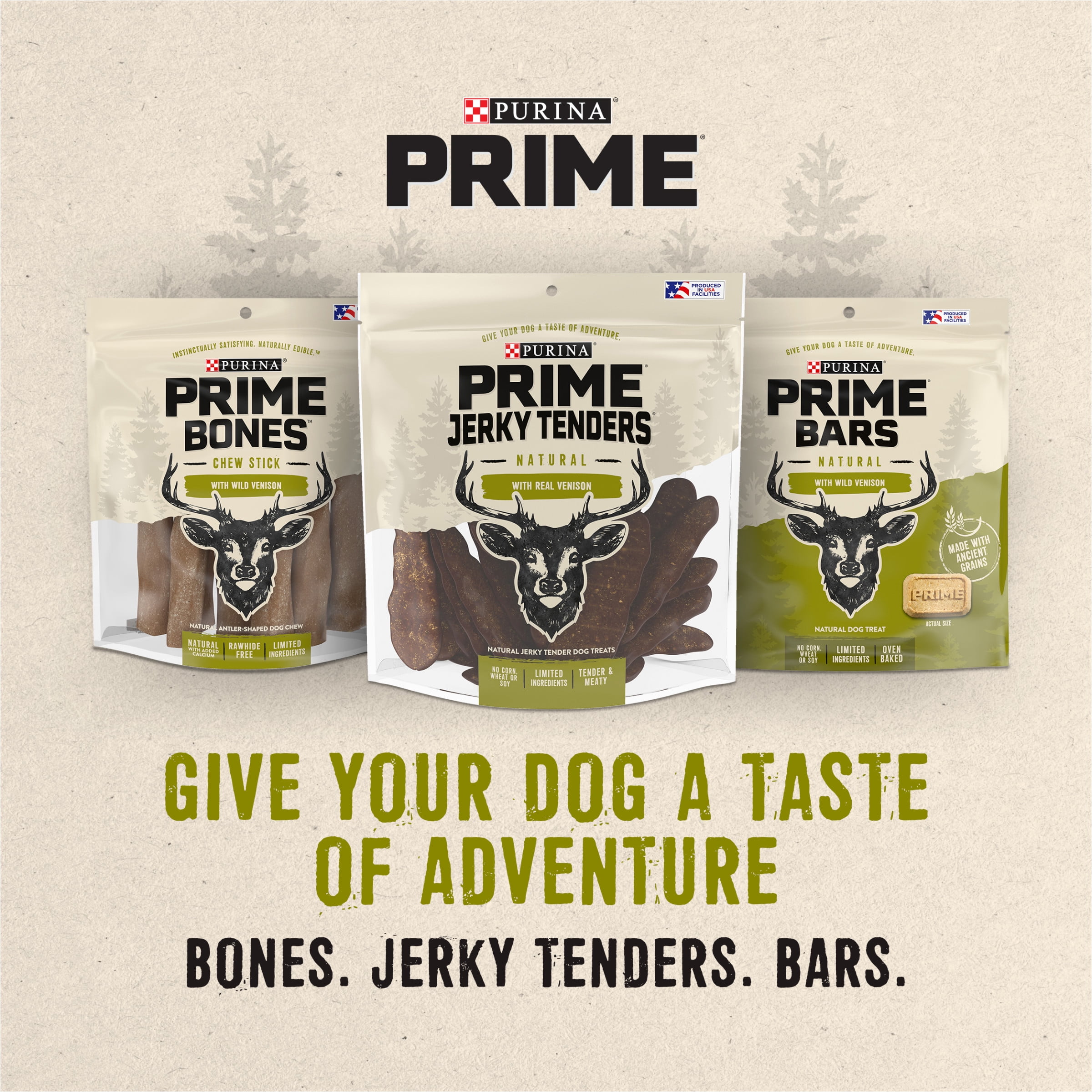 Bring a little flavor adventure to your dog’s day with the natural, satisfying crunch of Purina Prime Bars With Wild Venison dog treats. These natural baked dog biscuits feature only high-quality ingredients, including real wild venison and ancient grains. Plus, we make them without corn, wheat and soy as well as artificial colors, flavors and preservatives, and we make these adult dog treats with no bone meal or BHA. In the end, that creates limited ingredient dog treats full of everything you want for your furry friend and nothing you don’t. The oven baked dog treats delight your pup with a crunchy, satisfying texture sure to pique his interest. Grab a dog treat pouch of these medium dog biscuits for wholesome, high-quality dog treats you can both love. Give your best friend even more options to explore the enticing flavors of nature with Purina Prime Bars With Pasture-Fed Bison natural dog snacks and treats.