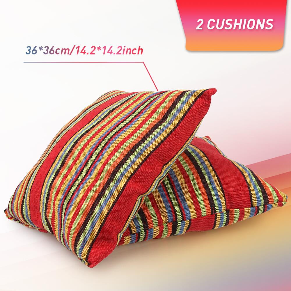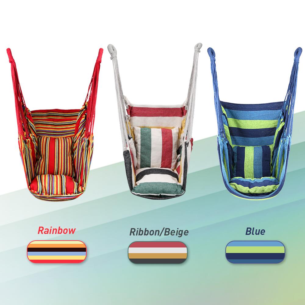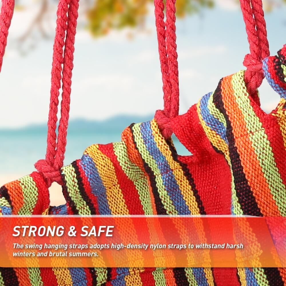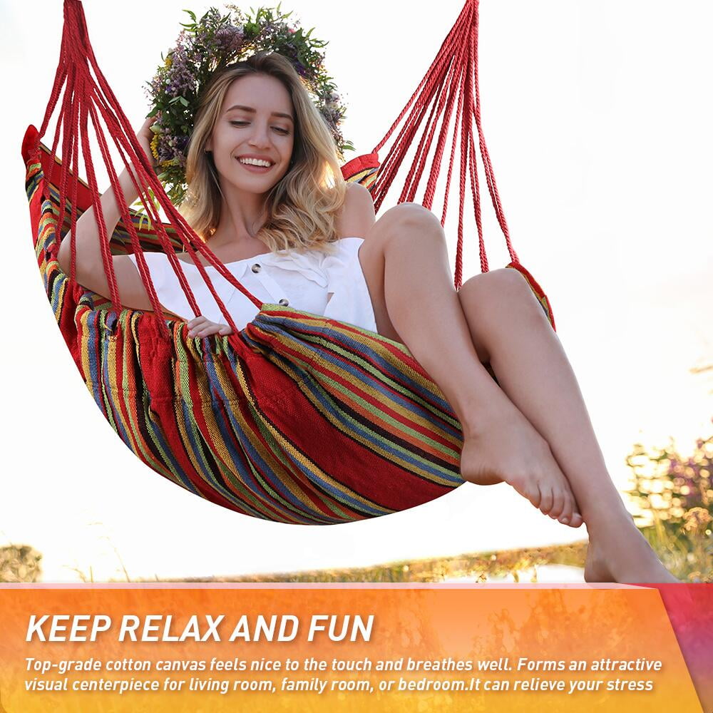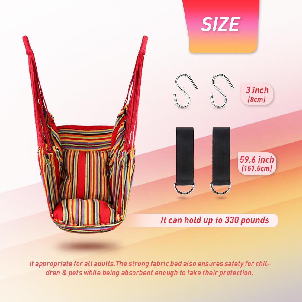 QUANFENG QF hammock chair is a fun summer hang out stop for the back yard or camping. The swing hanging hammock is made of cotton canvas and polyester material and the triple stitching on the main body of the swing chair makes it sturdy, so the hammock chair is super comfortable but durable enough to swing and lounge. The camping set comes with two straps to tie around tree trucks and carabiners to hook it up to help you easily set up the hammock. ( as the installation pictures show ) Moreover, the straps are compatible with all swings and hammocks, such as garden swings, patio swings, saucer swings, hammocks, tire swings, web swings, hammock swings, etc. Besides, there are two cotton canvas cushions for you to use them as a comfortable seat or back support. The size of the hammock swing seat is 40" x 51", and the size of each cushion is 14.2” x 14.2”. Therefore the hammock chair is suitable for One adults, even Small pets ( Weight Limit: 330 lbs ) to sit on it. In a few words, take our colorful hammock chair home and have very nice long resting or take lazy relaxation in any indoor and outdoor place such as living room, family room, bedroom, and beach.