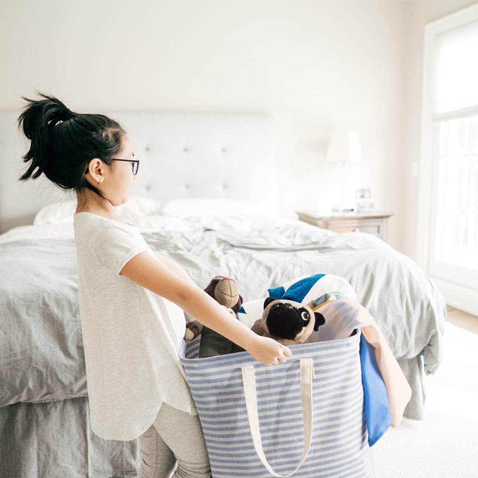 APPLICATION:Great basket for nurseries, with enough storage space for diapers, baby wipes, diaper rash cream, baby clothes, burp rags, teething toys, and lotion.Perfect organizer for play rooms, allowing for the storage of toys, books, blocks, stuffed animals, toys with multiple pieces, train sets, or board games.Chic design allows it to be used in the living room to hold throw blanket, pillows, and reading materials, as well as in the bathroom for towels, or as a laundry hamper.