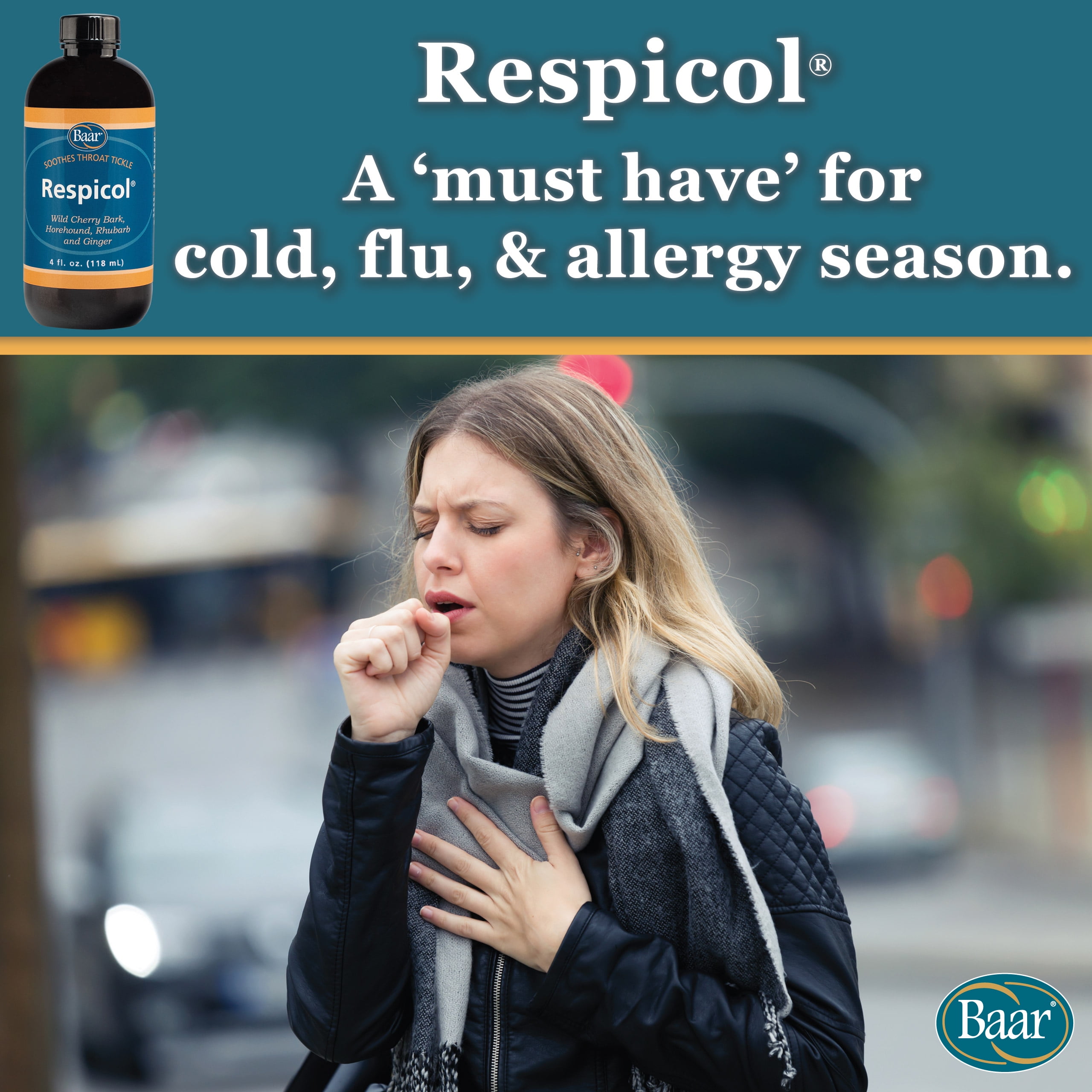 Respicol is the one formula you want to be sure to have in your home medicine chest. Working within minutes, it calms that annoying tickle in the throat providing fast relief. This gentle, pleasant tasting formula will soothe your throat when you need it most. Respicol is specially formulated to help calm irritated mucousal tissues, tone the digestive tract and cleanse the system. This all-natural, herbal syrup will not make you drowsy. Prepare for the onset of seasonal challenges and get your Respicol today!