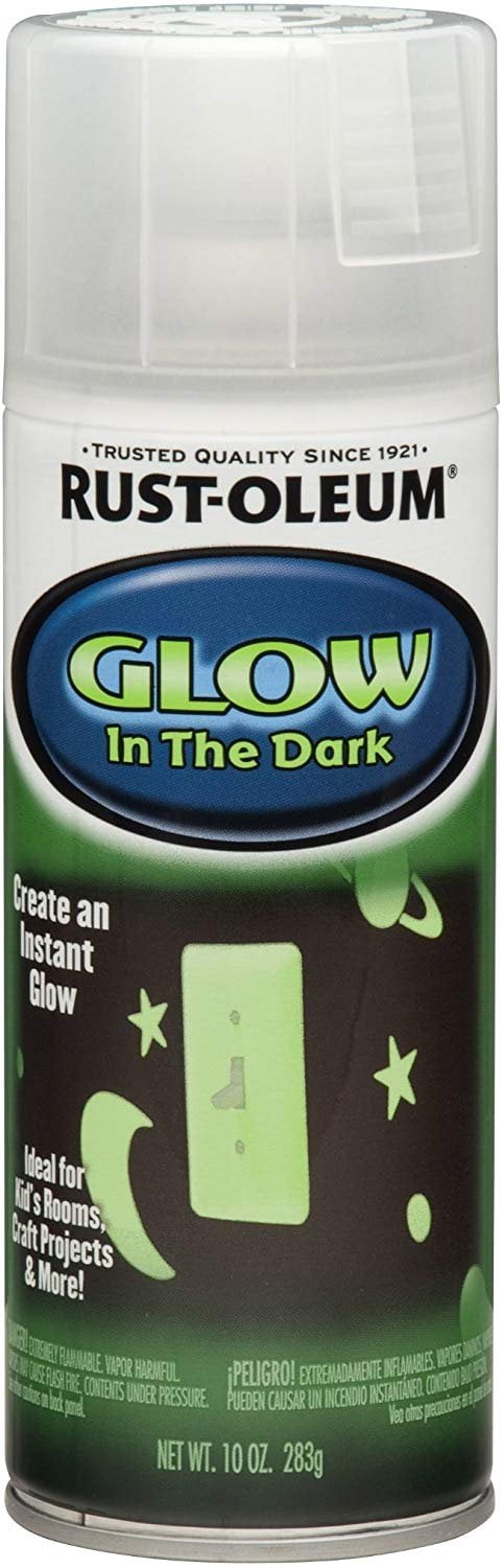 Rust-Oleum glow in the dark spray is a liminous paint that can give objects a gow effect that can last four to eight hours after being activated by light
